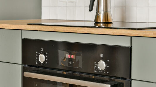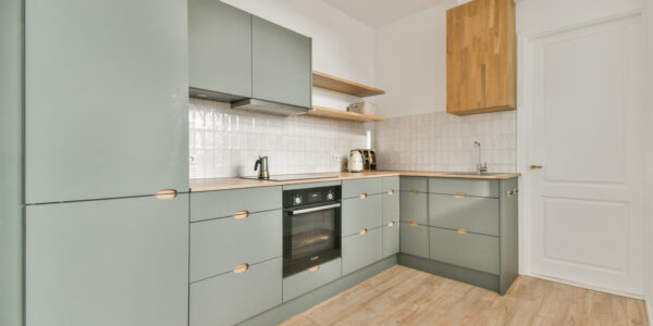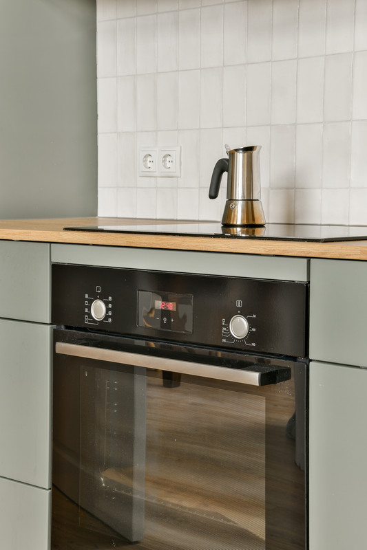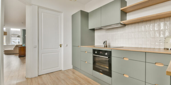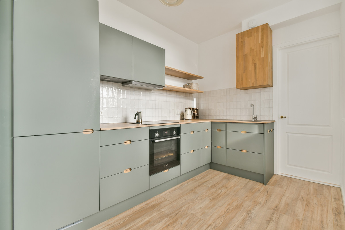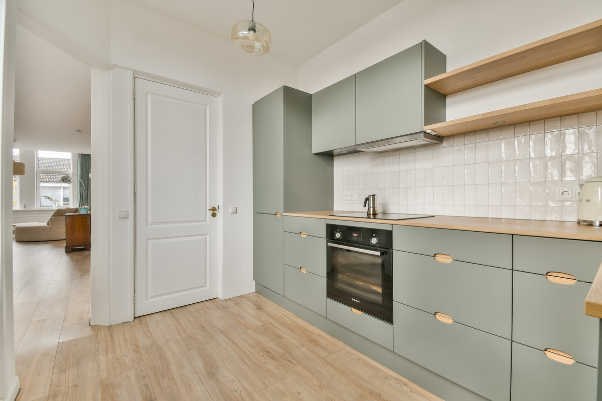 De nieuwe keuken in L-opstelling is modern vormgegeven en uitgerust met hoogwaardige inbouwapparatuur, waaronder een inductiekookplaat, afzuigkap, oven, koel-/vriescombinatie, en vaatwasser. Hier bevindt zich tevens de combiketel (Remeha, 2024) en een deur naar het balkon.