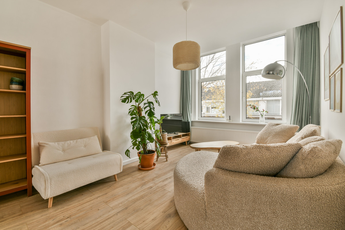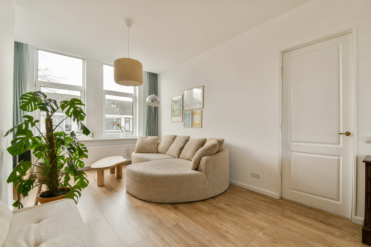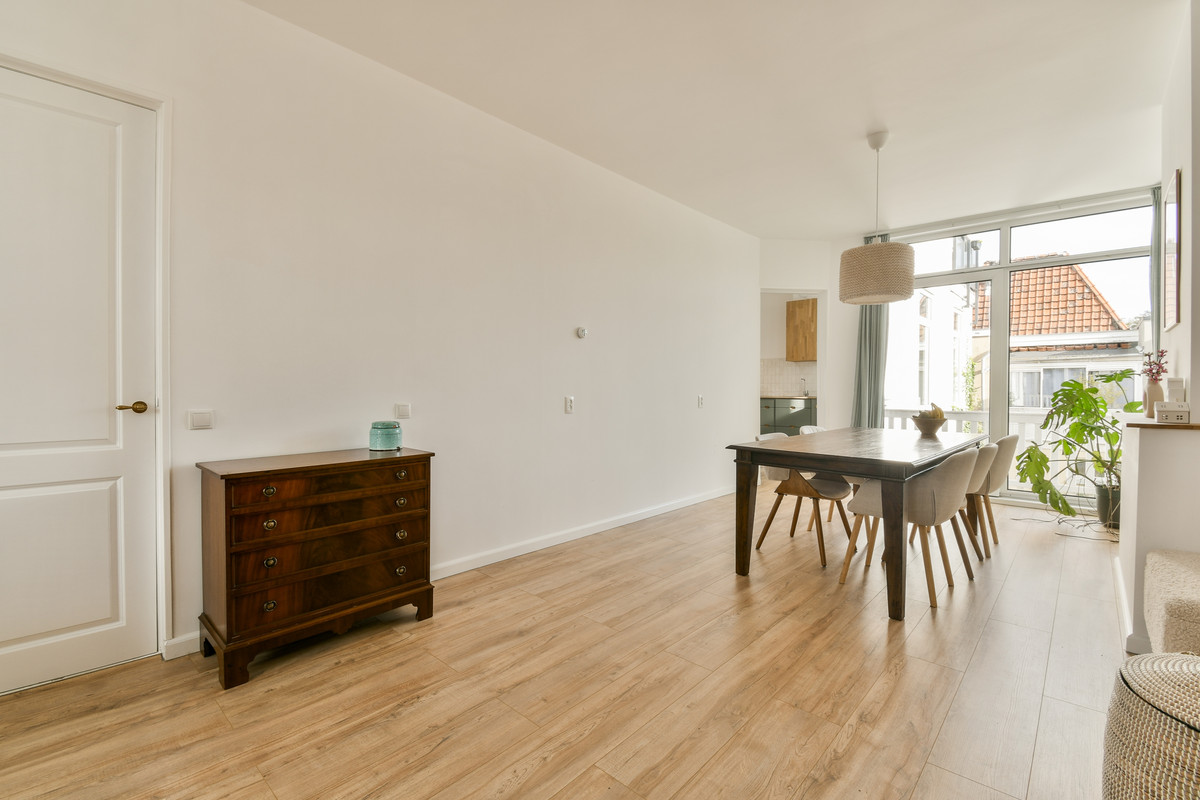 De woonkamer is licht en ruim, voorzien van een moderne laminaatvloer, grote raampartijen met draai-/kiepramen en een schuifpui naar het balkon. De vele ramen zorgen voor een fijne lichtinval en een ruimtelijk gevoel. Het balkon, gelegen op het oosten, is een heerlijke plek voor een kop koffie in de ochtendzon.