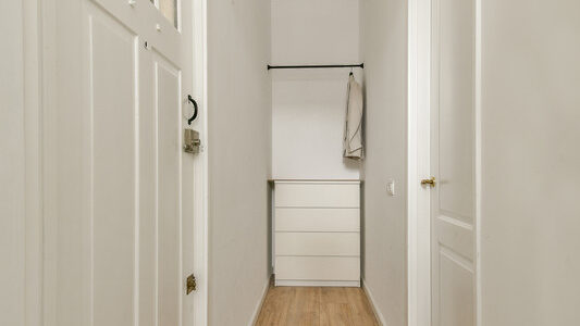 Via het open portiek bereikt u de entree van de woning. In de ontvangsthal bevinden zich in een werk-/kastenkamer de meterkast (10 groepen, 3 aardlekschakelaars). Via de hal heeft u toegang tot de verschillende vertrekken.