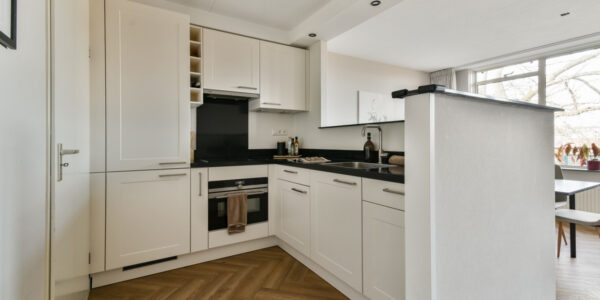 De open keuken is uitgevoerd in een praktische L-opstelling en voorzien van diverse inbouwapparatuur, waaronder een koel-/vriescombinatie, een inductiekookplaat met afzuigkap, een combimagnetron en een vaatwasser.