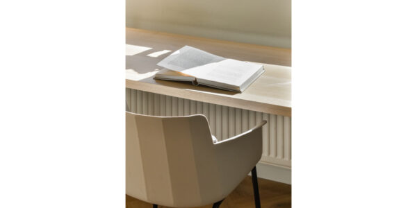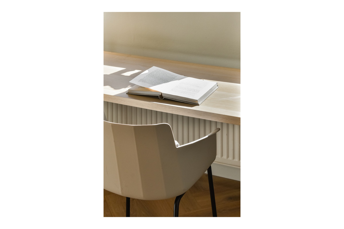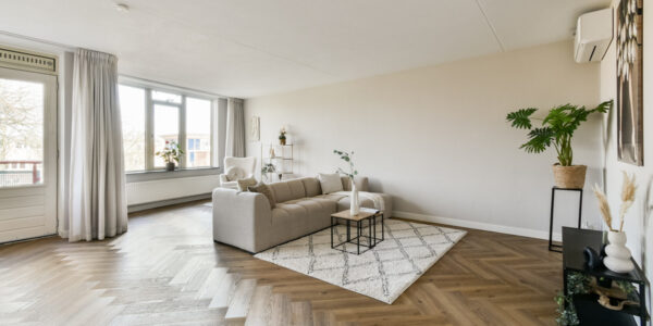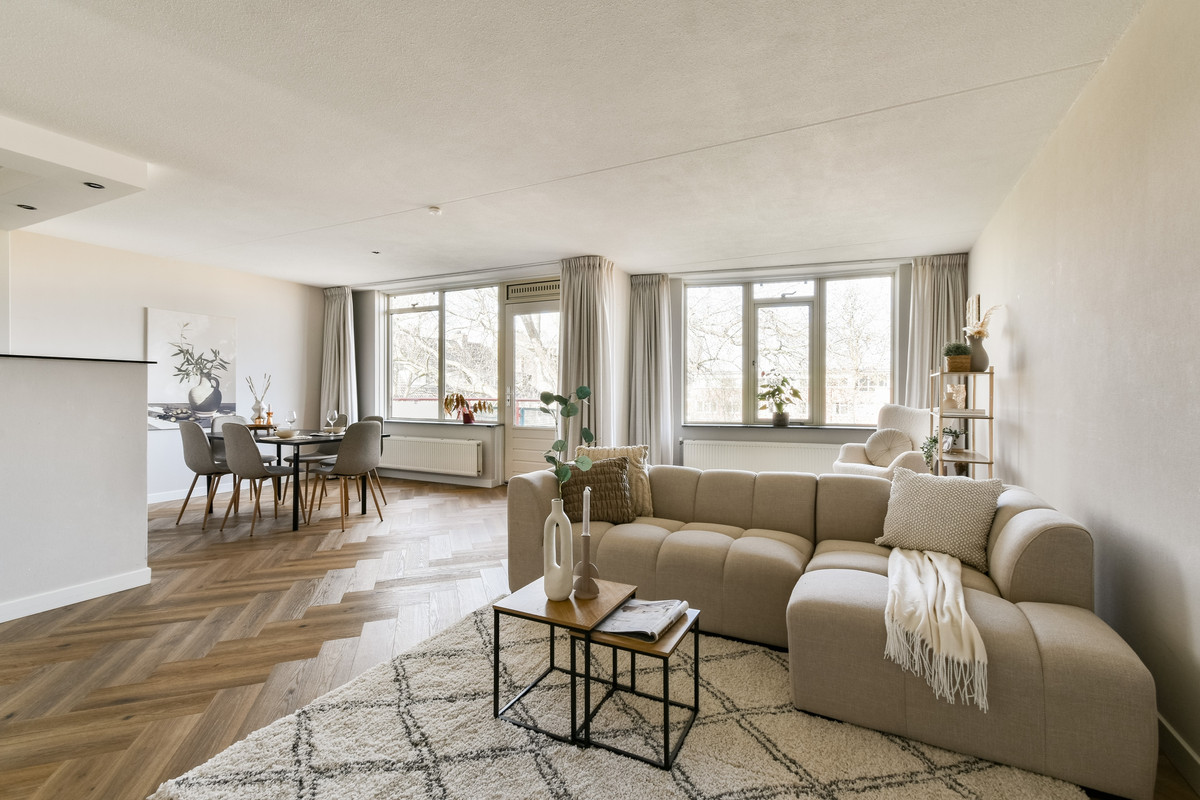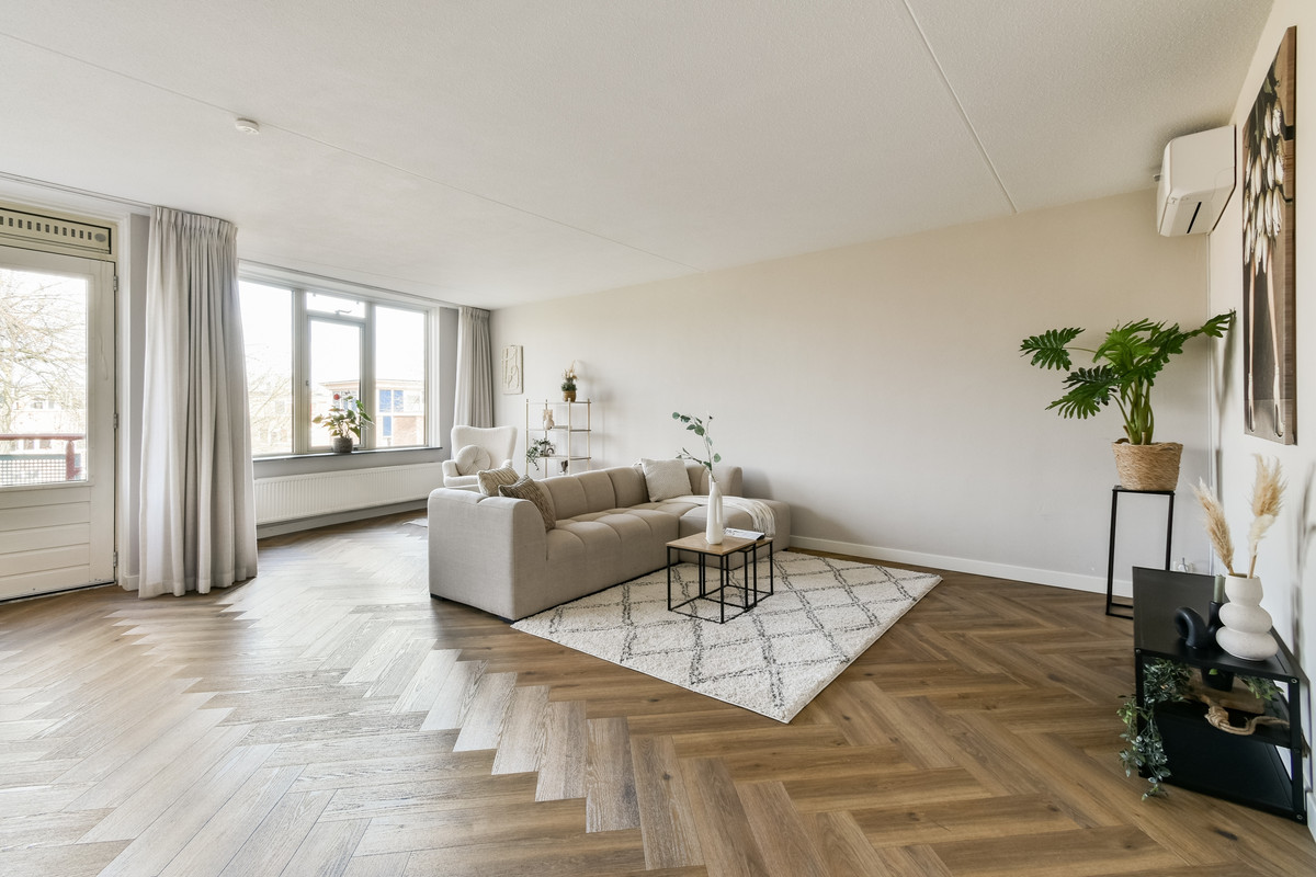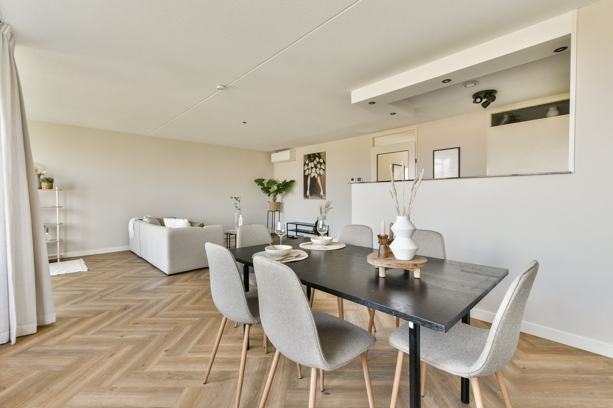 Aan het einde van de hal kom je in de ruime en lichte woonkamer. Dankzij de grote raampartijen en de open indeling voelt deze ruimte bijzonder ruim en prettig aan. De woonkamer is voorzien van airconditioning en staat in open verbinding met de keuken. Vanuit de woonkamer is tevens het balkon bereikbaar, dat is gelegen op het noordwesten en een prettig uitzicht biedt op het groen en het naastgelegen speelpleintje.