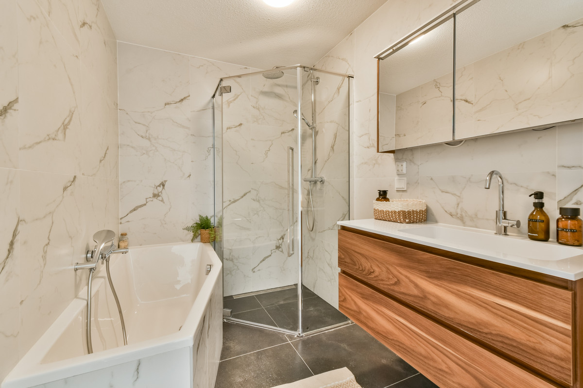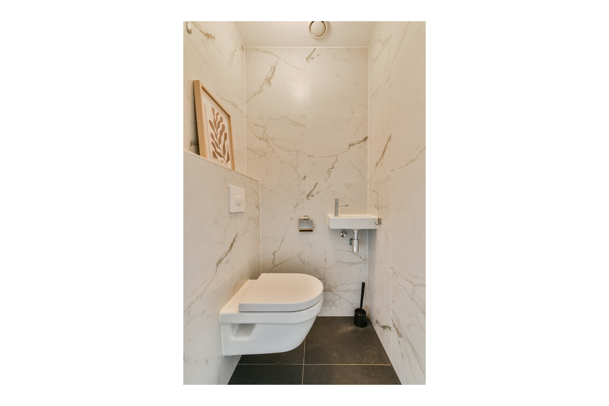 De moderne badkamer is compleet uitgevoerd en beschikt over een ligbad, een ruime inloopdouche, een stijlvol wastafelmeubel en een handdoekradiator. De ruimte wordt geventileerd via het mechanische ventilatiesysteem. Naast de badkamer bevindt zich de separate toiletruimte met een modern hangend toilet en fonteintje.