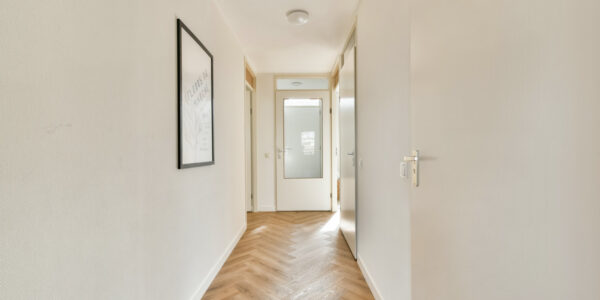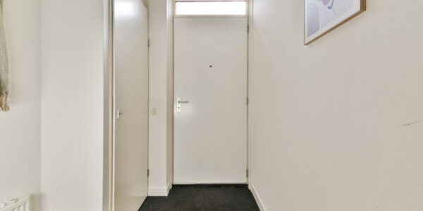 Entree van het appartement met een ontvangsthal voorzien van meterkast (6 gr.) en garderoberuimte. Vanuit de hal zijn alle vertrekken toegankelijk.