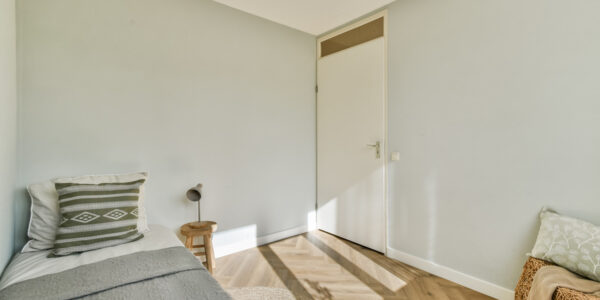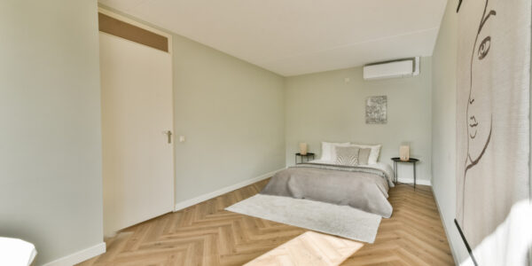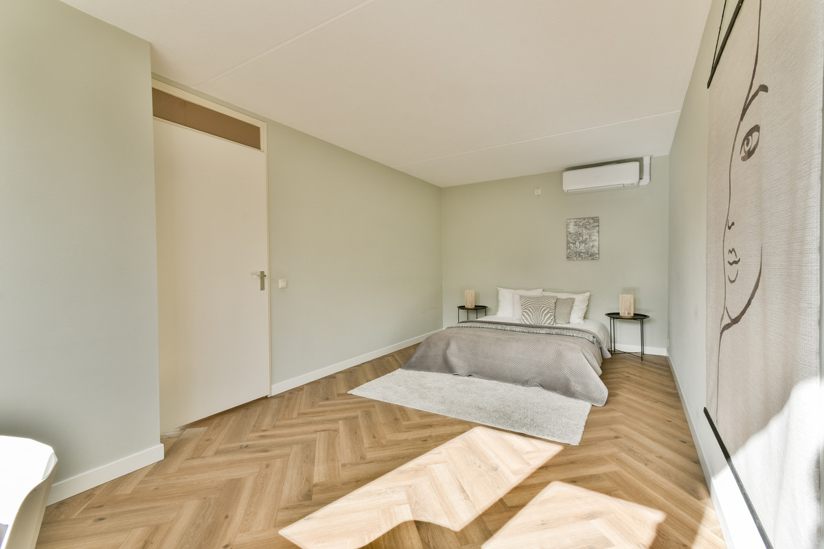 Aan de linkerzijde bevindt zich de eerste slaapkamer. Aan de rechterzijde ligt de tweede slaapkamer, die is uitgerust met een airconditioning voor extra comfort.