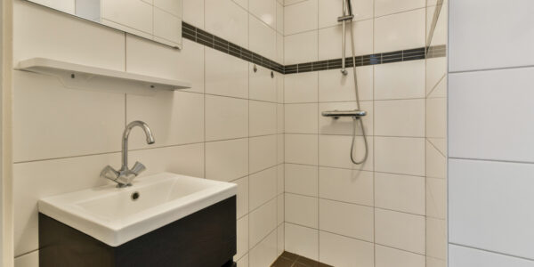 Aansluitend aan de slaapkamer bevindt zich de badkamer, uitgerust met een douche en wastafelmeubel – netjes onderhouden en functioneel ingedeeld.
