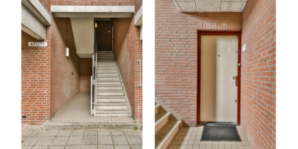 portiek met brievenbussen en trappenhuis naar de eerste verdieping waar zich bevinden: