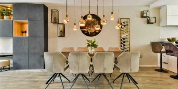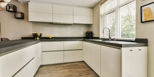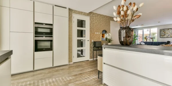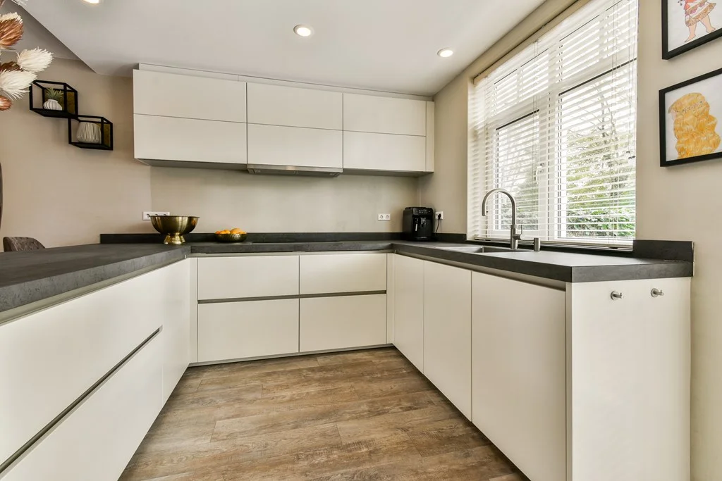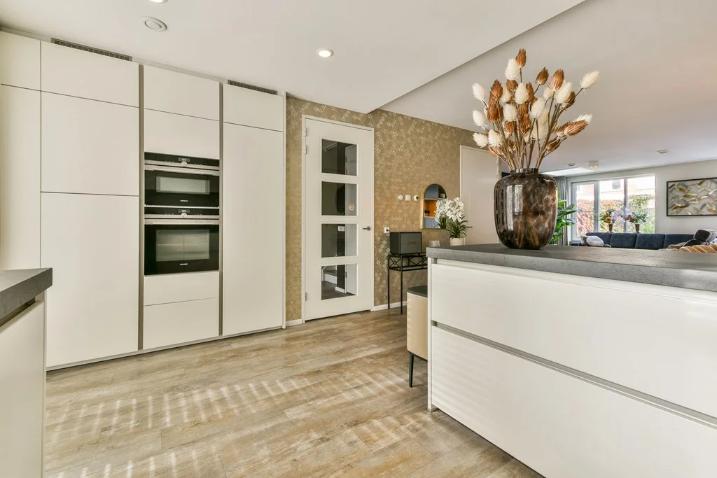 De open keuken aan de voorzijde is een lichte en uitnodigende ruimte met openslaande deuren naar de voortuin. De keuken is luxe uitgevoerd en voorzien van een Quooker, vaatwasser, inductiekookplaat, afzuigkap, combimagnetron, stoomoven, koelkast en vriezer – perfect voor wie houdt van koken en samenzijn.