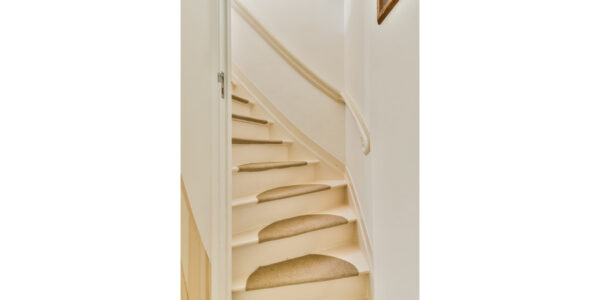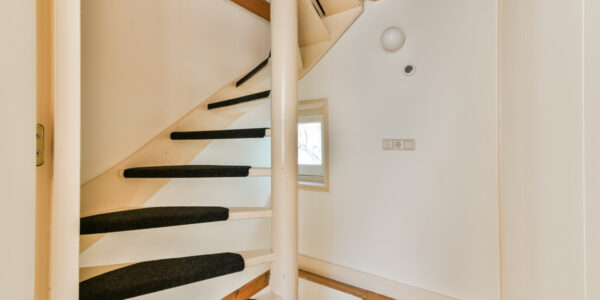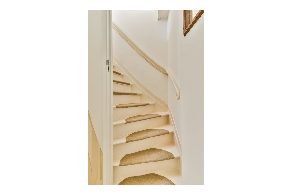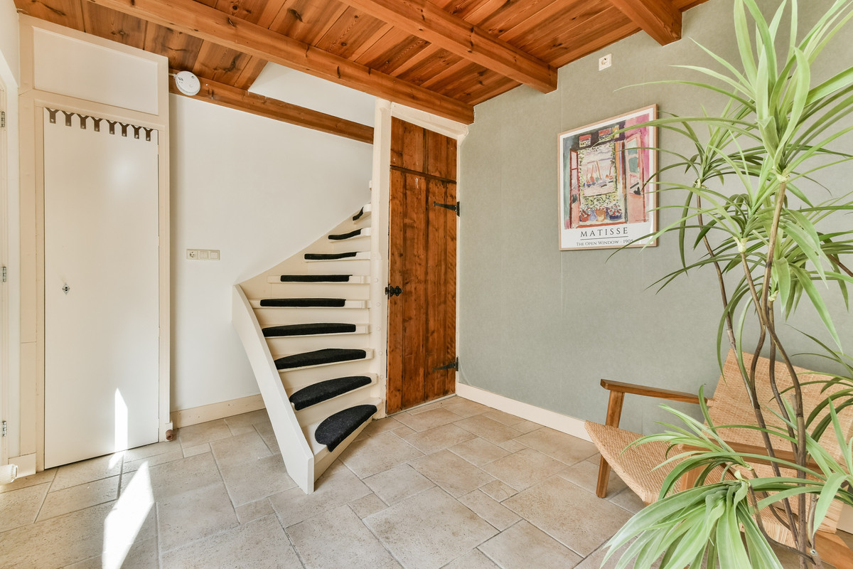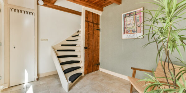 Overloop met trap naar de tweede verdieping en toegang tot een slaapkamer, voorzien van een inbouwkast.