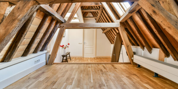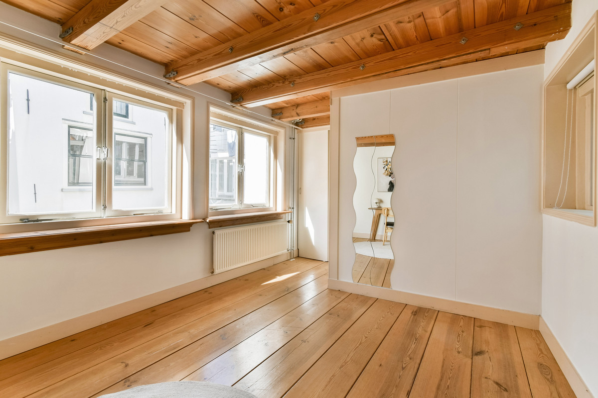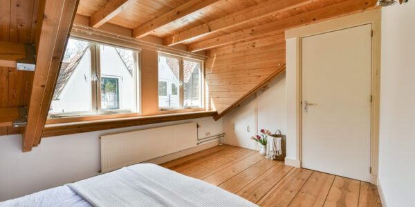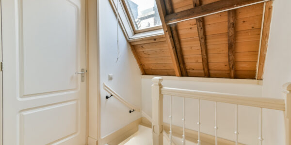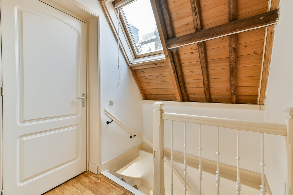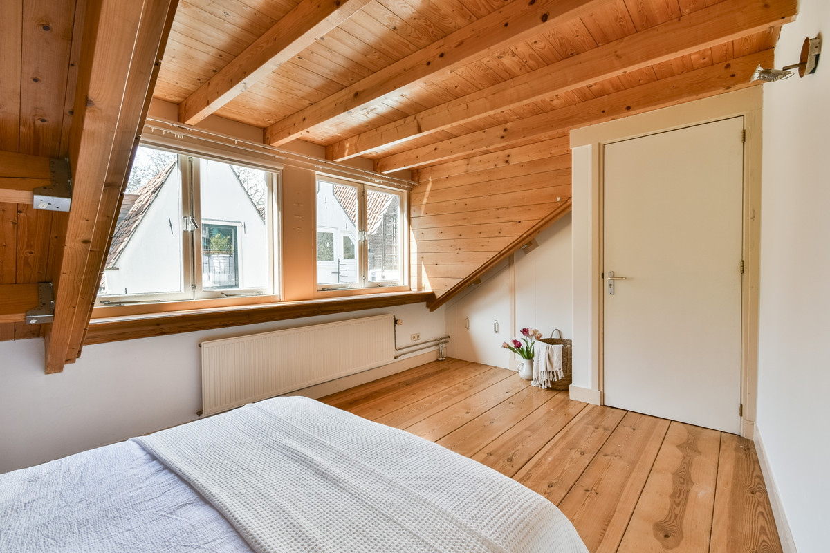 Op de bovenste verdieping bevindt zich nog een slaapkamer met dakkapel en een kast met opstelplaats voor een Atag-combiketel.
