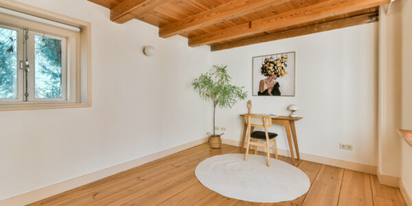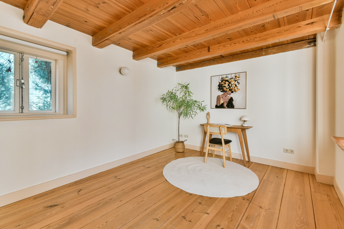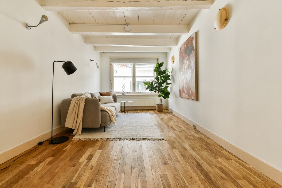 De eerste verdieping vormt een prachtige leefetage met een ruime en lichte woonkamer. De fraaie houten vloer en het authentieke balkenplafond geven deze ruimte een warme en karaktervolle uitstraling. Aan de voorzijde bieden de ramen een schilderachtig uitzicht over de bomen en monumentale gevels van de Hooglandse Kerkgracht.