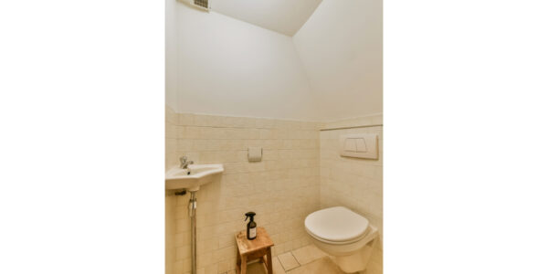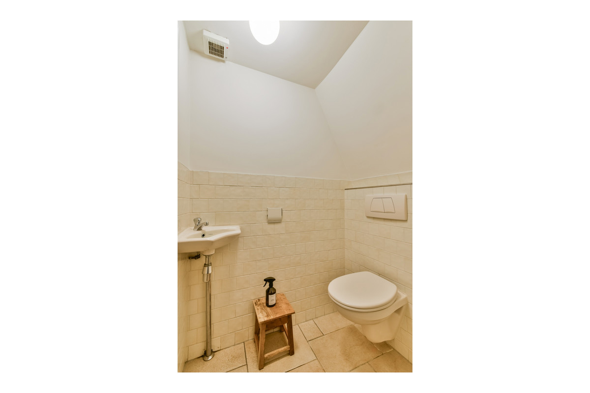 Een tussenhal leidt naar een tweede inpandige berging en een toiletruimte met hangend toilet en fontein. Vanuit hier bereikt u tevens de trap naar de eerste verdieping.