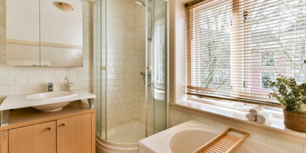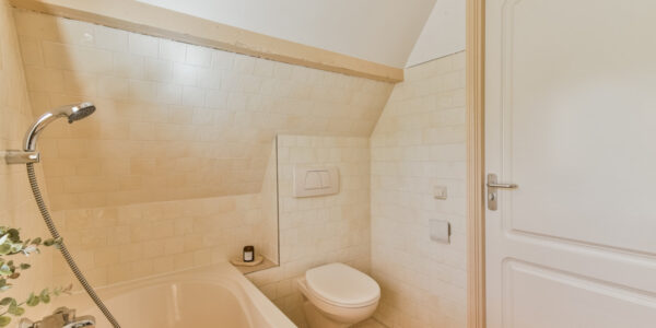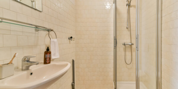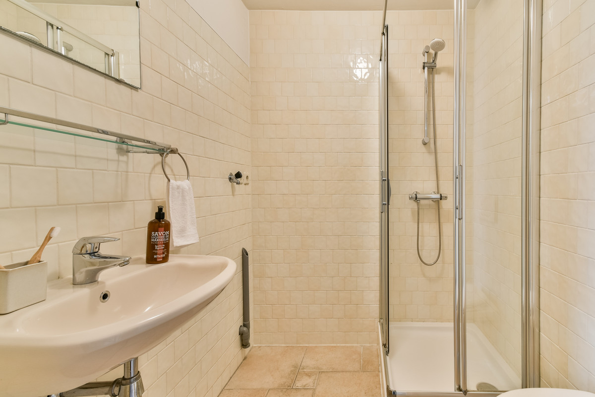 Aan de voorzijde bevindt zich de badkamer, uitgerust met douchecabine, ligbad, wastafelmeubel, hangend toilet, handdoekradiator en mechanische ventilatie.