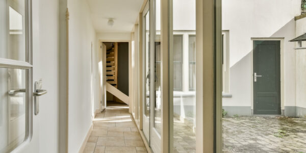 Een lichte tussenhal met grote raampartijen en openslaande deuren vormt de verbinding met het achterhuis en zorgt voor een prachtige interactie tussen binnen en buiten.