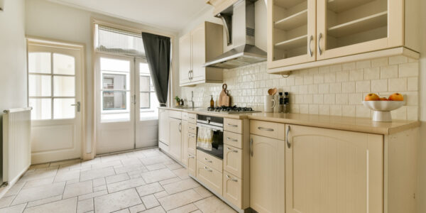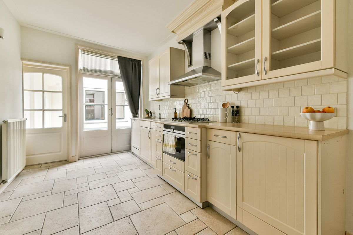 Aan de achterzijde bevindt zich de woonkeuken, opgesteld in een praktische rechte opstelling en voorzien van diverse apparatuur, waaronder een vaatwasser, 5-pits gaskookplaat, afzuigkap, oven, vriezer en close-in boiler. Openslaande deuren verbinden de keuken met de ruime stadstuin op het oosten – een heerlijke, beschutte plek waar u ’s ochtends in alle rust van de zon kunt genieten.