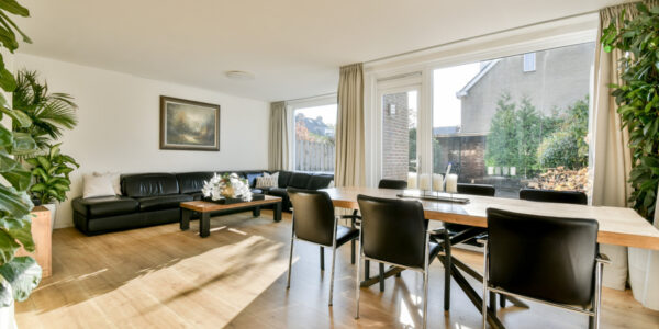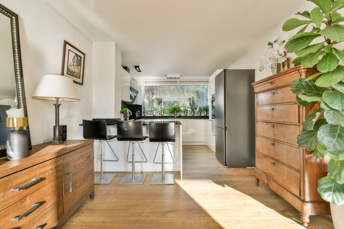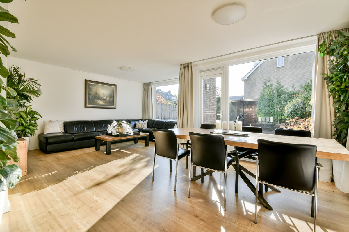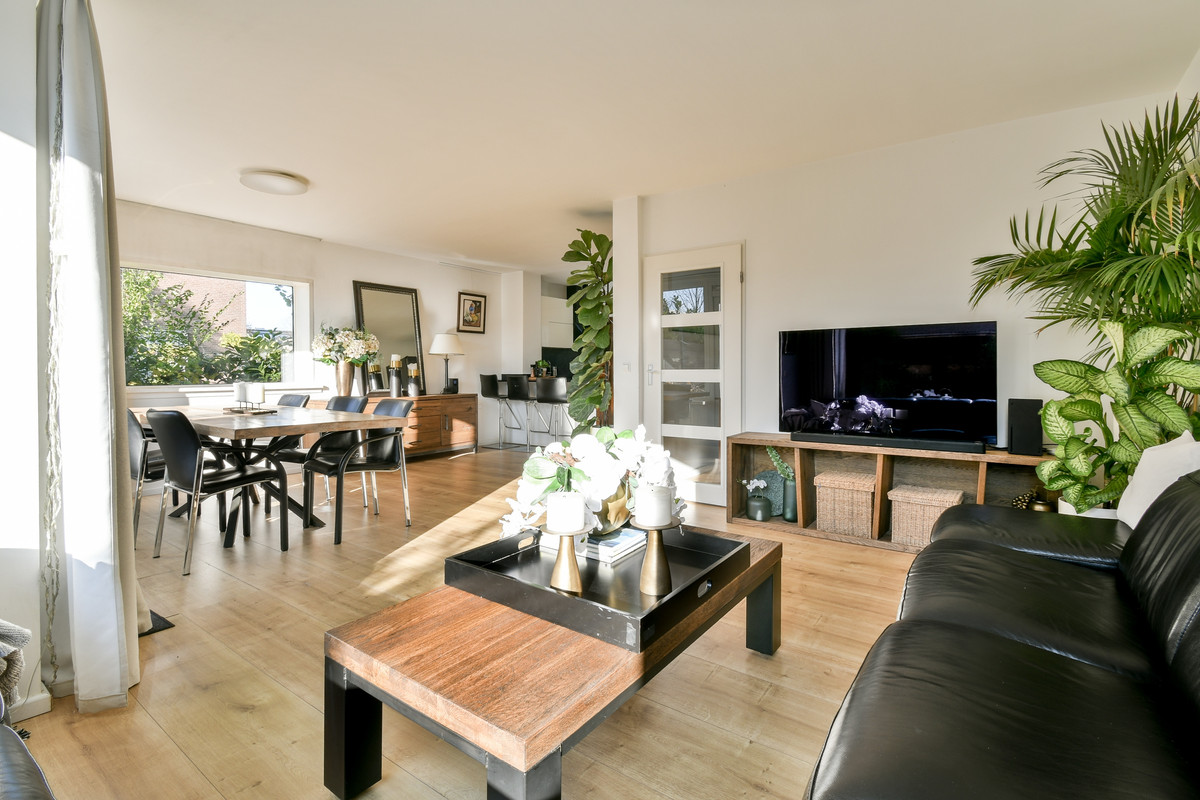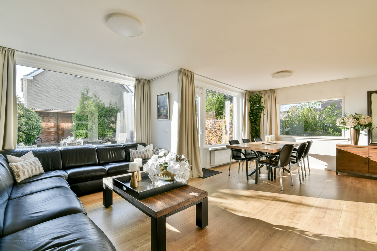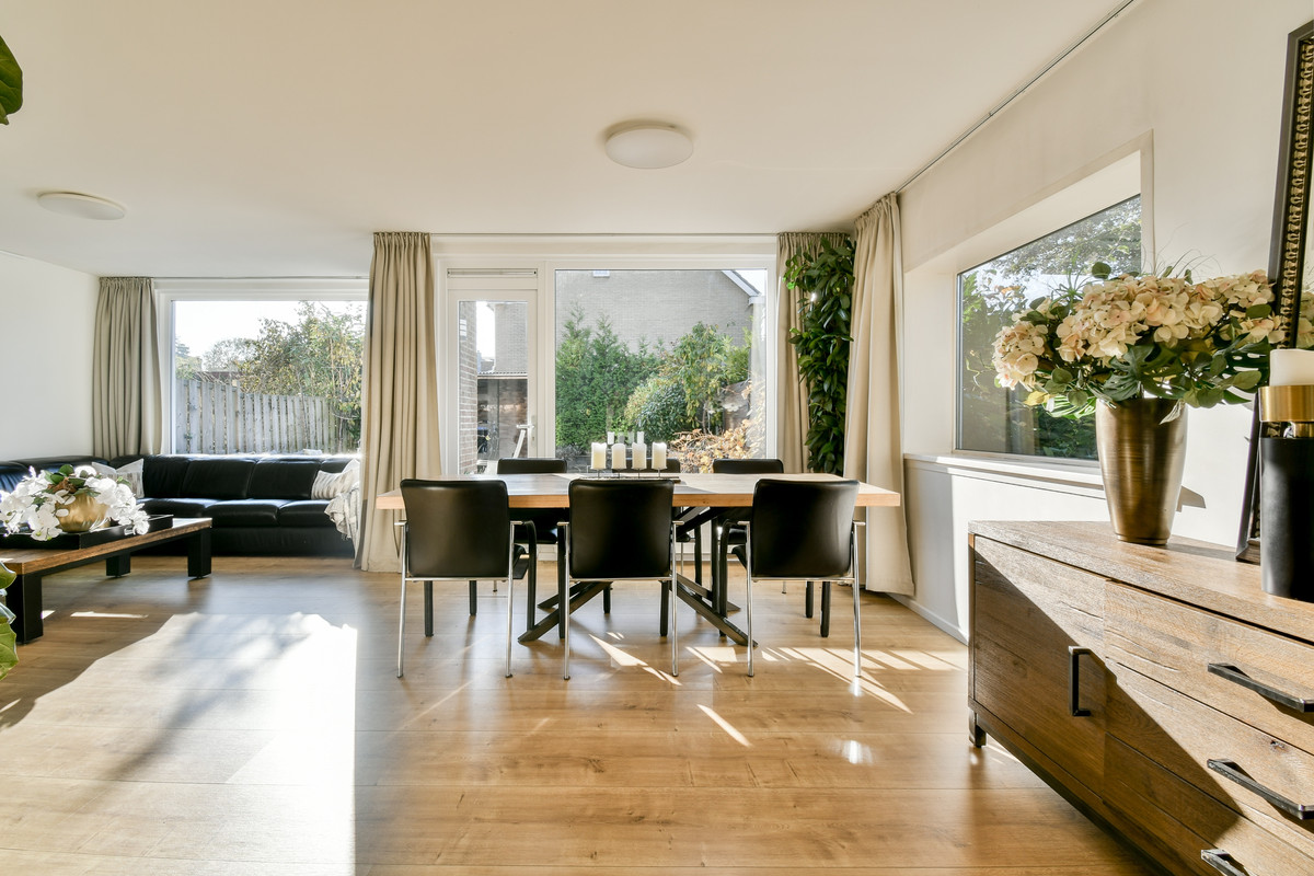 De ruime en lichte woonkamer vormt het hart van de woning. Dankzij de grote raampartijen en de gunstige hoekligging geniet je hier de hele dag van natuurlijk licht. Aan de voorzijde bevindt zich de moderne open keuken, compleet met een gezellige bar en hoogwaardige inbouwapparatuur: een stoomoven, combimagnetron, vaatwasser, inductiekookplaat, afzuigkap en koel-/vriescombinatie. Hier is het heerlijk koken en tafelen met uitzicht op de voortuin.