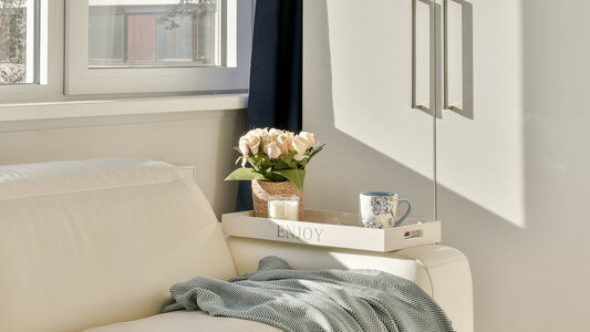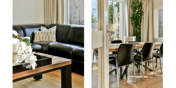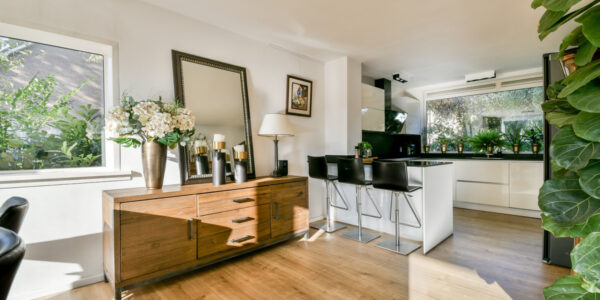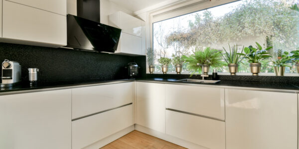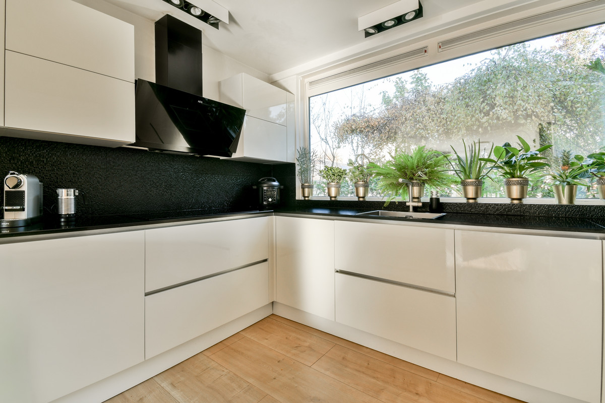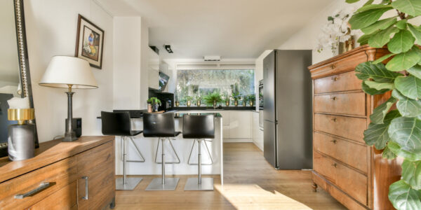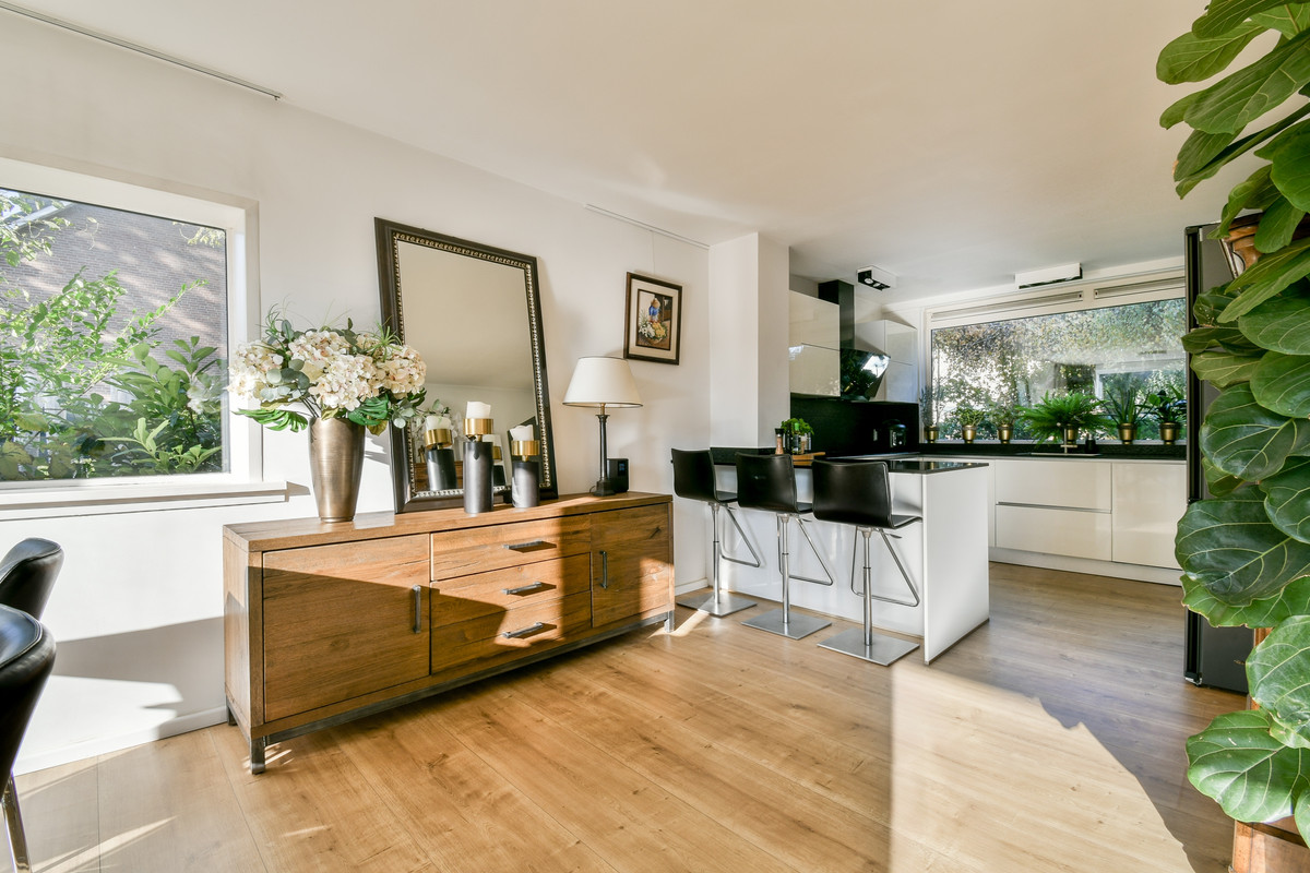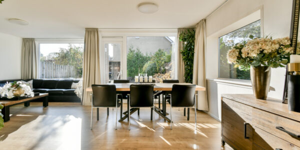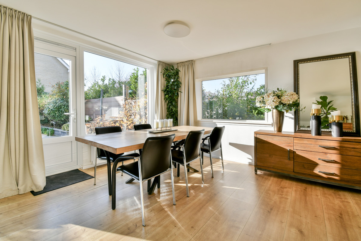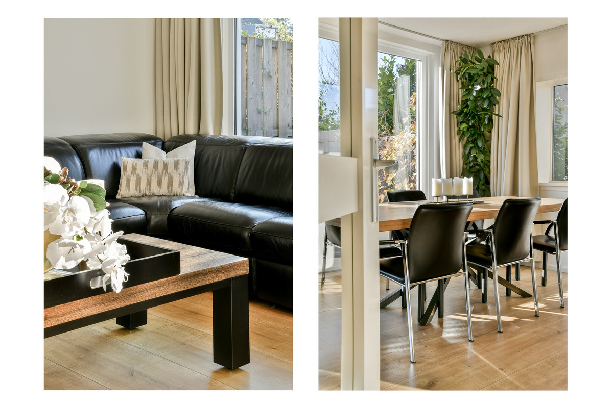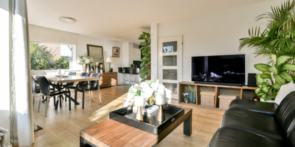 De ruime en lichte woonkamer vormt het hart van de woning. Dankzij de grote raampartijen en de gunstige hoekligging geniet je hier de hele dag van natuurlijk licht. Aan de voorzijde bevindt zich de moderne open keuken, compleet met een gezellige bar en hoogwaardige inbouwapparatuur: een stoomoven, combimagnetron, vaatwasser, inductiekookplaat, afzuigkap en koel-/vriescombinatie. Hier is het heerlijk koken en tafelen met uitzicht op de voortuin.