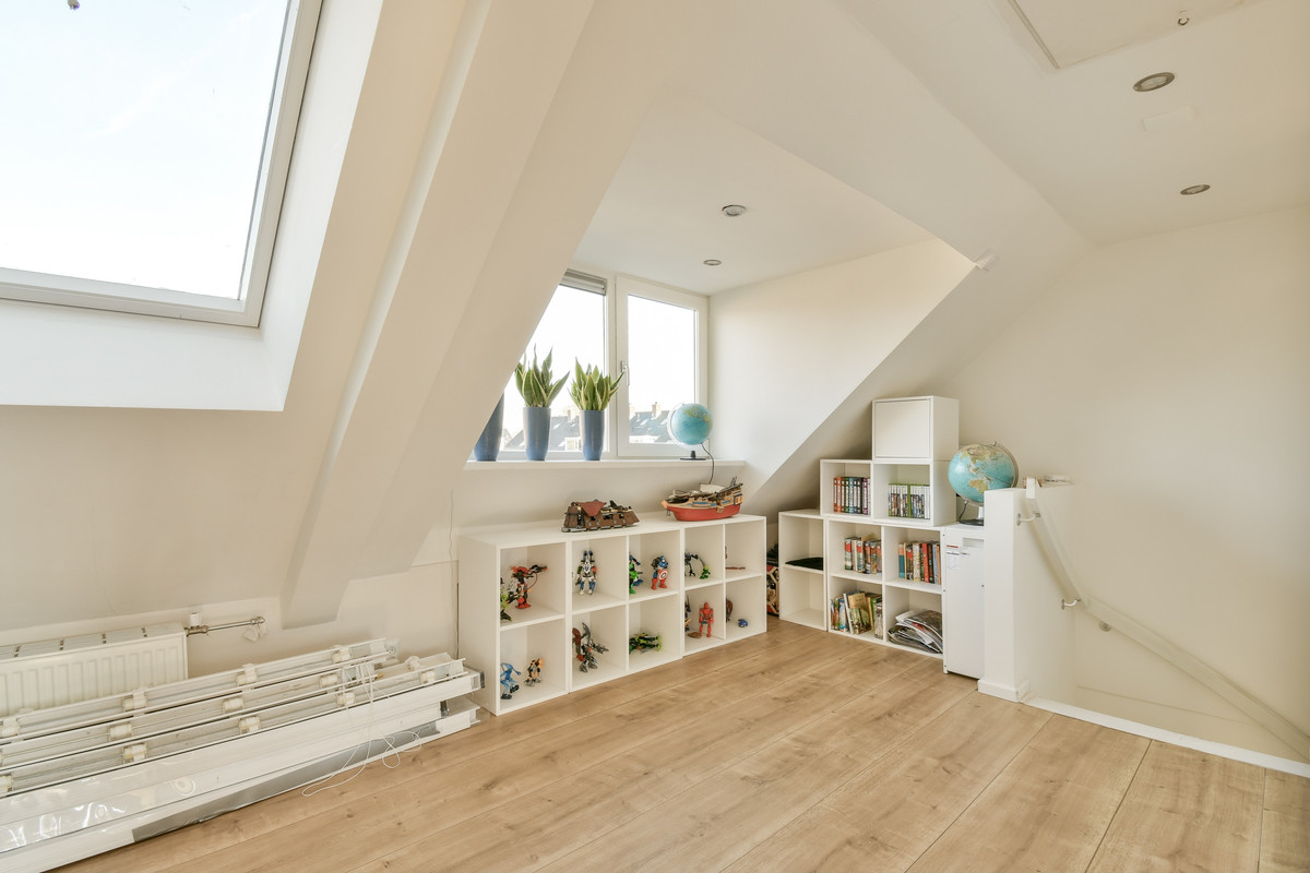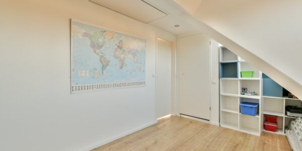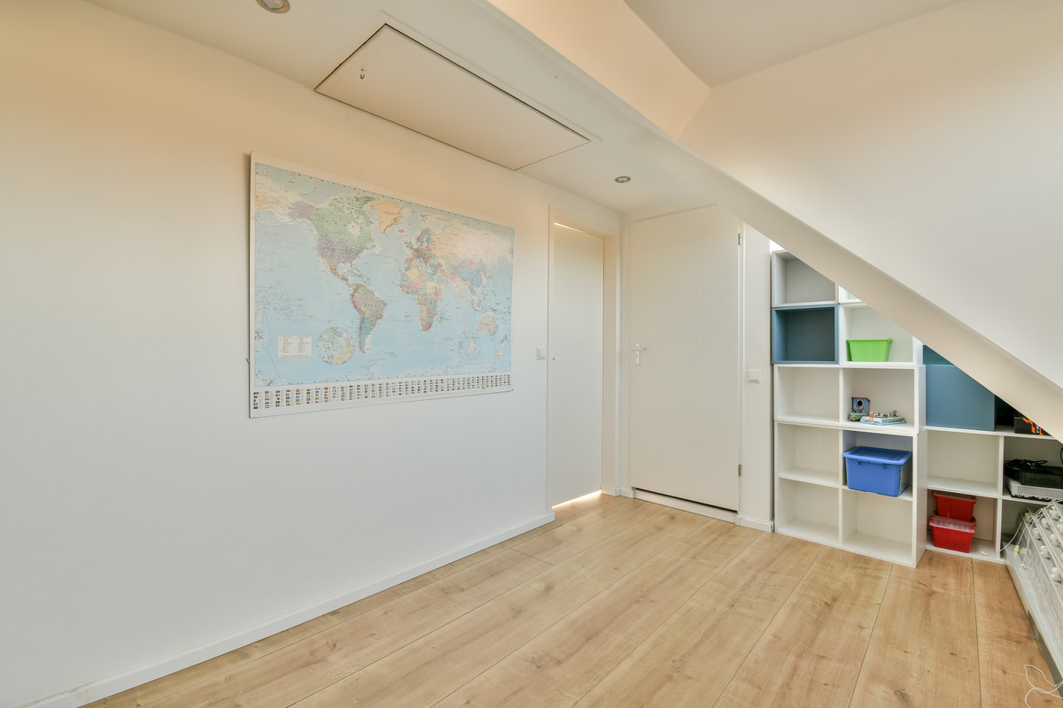 De tweede verdieping is een volwaardige woonetage. De ruime overloop met dakkapel biedt plaats aan de thuisbatterij (Alpha ESS, bouwjaar 2024), de combiketel (Intergas, bouwjaar 2017) en beschikt daarnaast over extra bergruimte. Daarnaast bevindt zich hier een tweede badkamer met inloopdouche, hangend toilet en wastafelmeubel – ideaal voor gasten of een groter gezin. De vierde slaapkamer, met dakkapel over de volle breedte, is licht, ruim en praktisch ingedeeld.