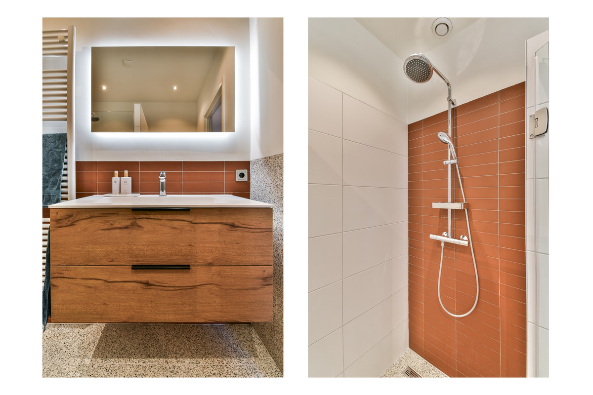 Op deze verdieping bevindt zich ook de moderne badkamer met inloopdouche, wastafelmeubel, hangend toilet, handdoekradiator en mechanische ventilatie. Via de overloop bereik je eveneens het dakterras, een heerlijke buitenruimte.