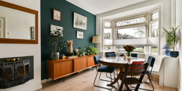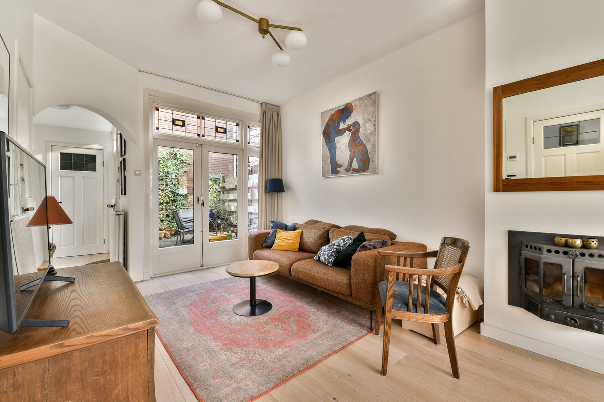 De woonkamer is een heerlijke plek om te ontspannen. De erker aan de voorzijde zorgt voor een mooie lichtinval en geeft de ruimte extra charme. De glas-in-lood raampjes en de houtkachel maken het plaatje compleet — ideaal voor warme, knusse avonden. Dankzij de openslaande deuren naar de achtertuin loopt de ruimte prachtig door naar buiten. Een handige trapkast biedt extra bergruimte, zonder dat dit ten koste gaat van het woongenot.