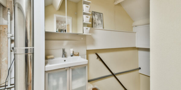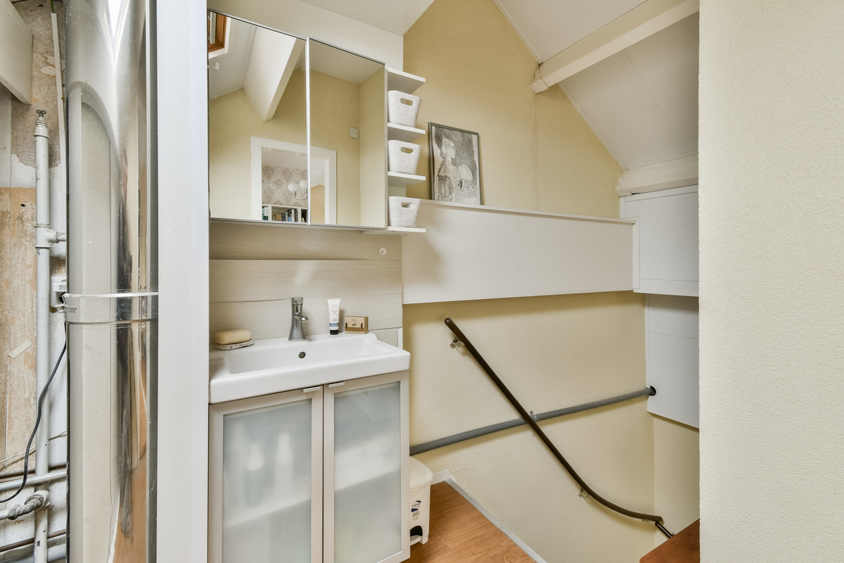 Op de overloop bevindt zich een wastafelmeubel en een Velux dakraam dat zorgt voor natuurlijke lichtinval. Achter de knieschotten is praktische bergruimte aanwezig, evenals de opstelplaats van de combiketel (Remeha, bouwjaar 2022).