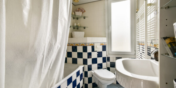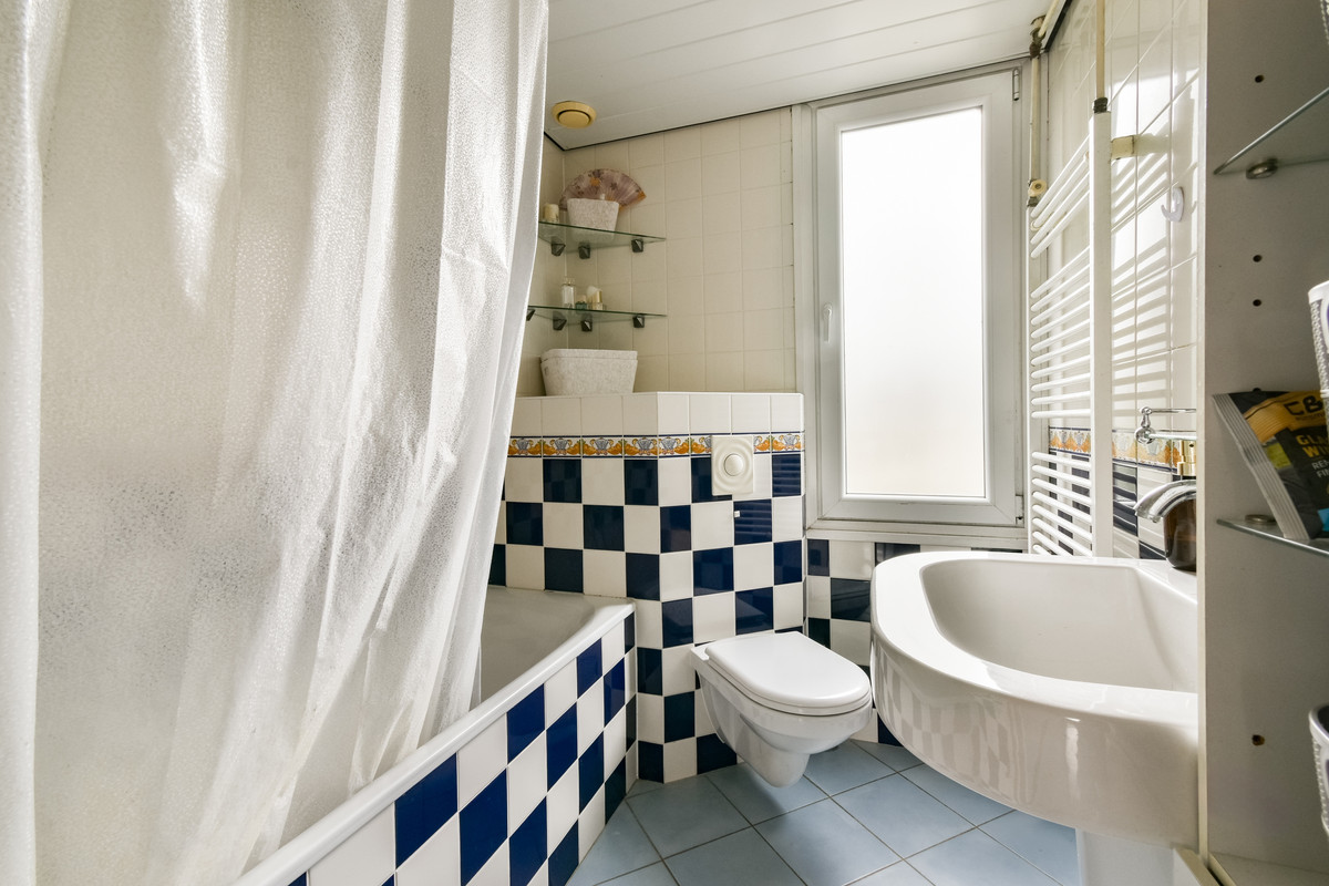 De badkamer is compleet uitgevoerd en voorzien van een ligbad met douchecombinatie, een hangend toilet, een wastafelmeubel en een handdoekradiator.