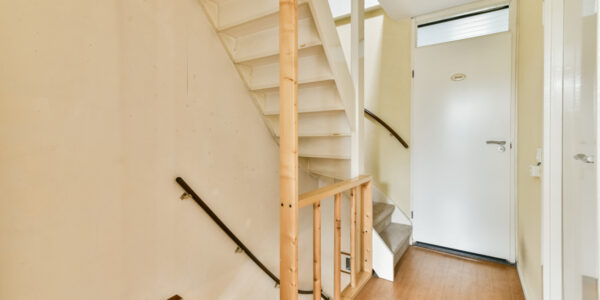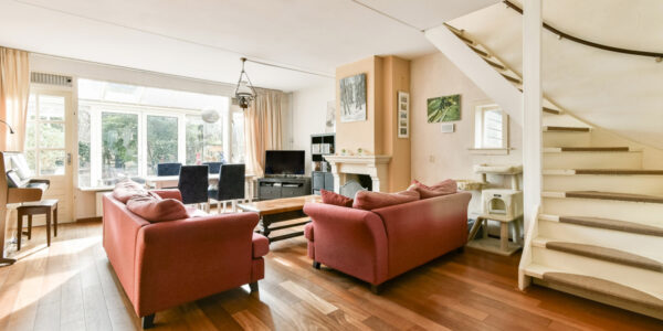 De woonkamer is sfeervol en ruim opgezet, voorzien van een houten vloer en een gezellige gashaard. De trap naar de eerste verdieping bevindt zich in de woonkamer, wat zorgt voor een speelse indeling.
