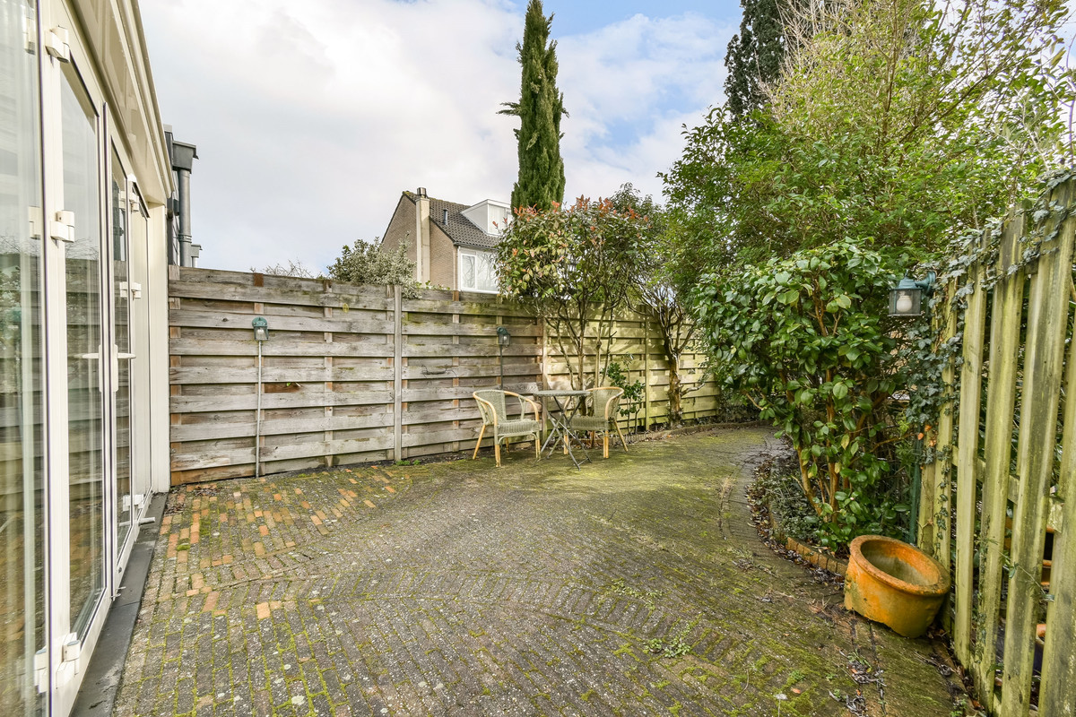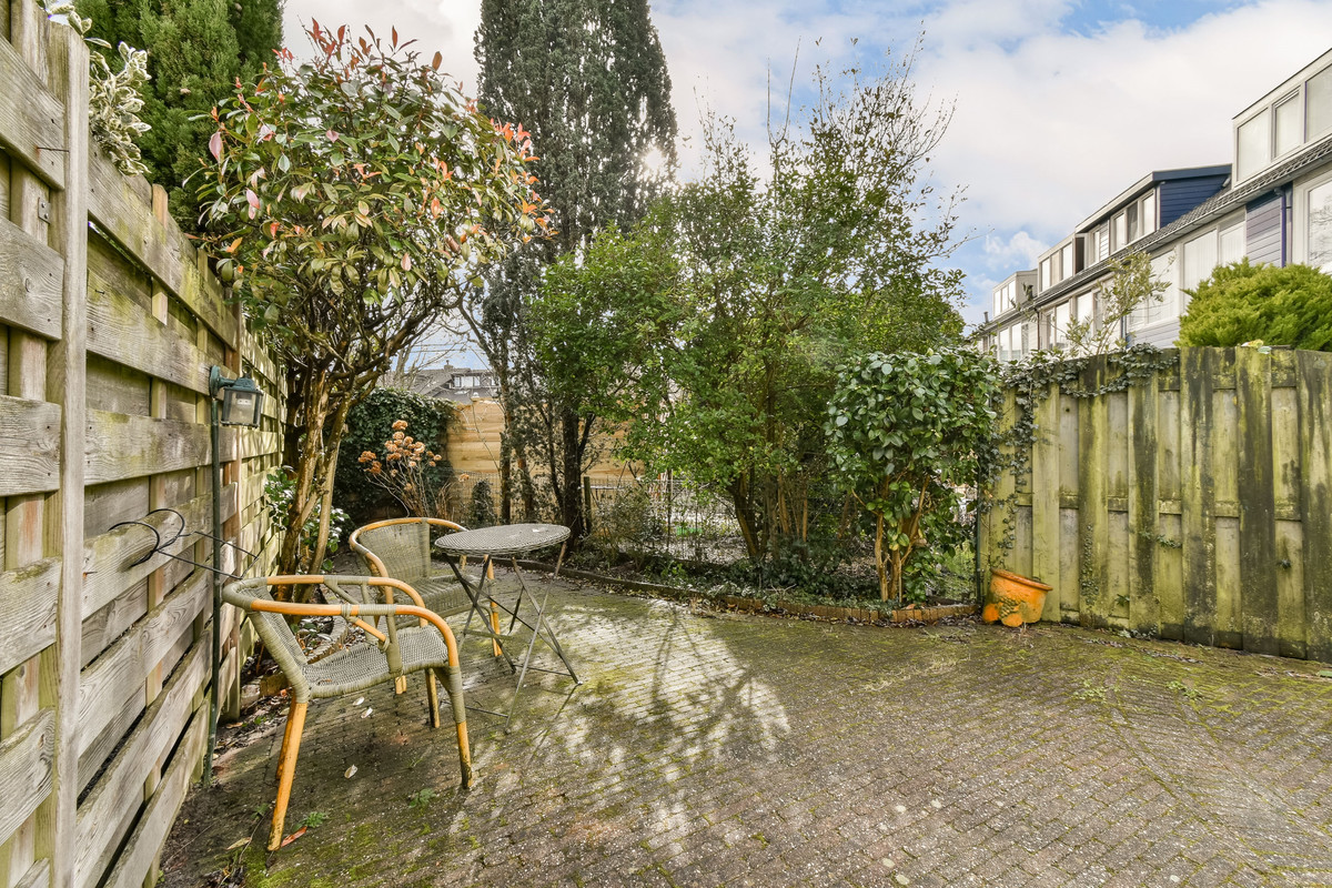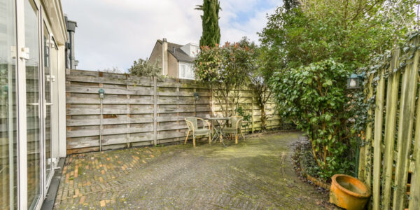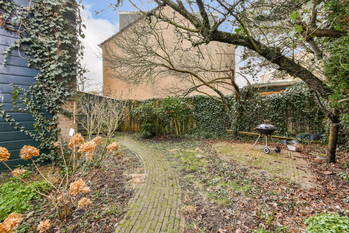 De achtertuin is gelegen op het zuidoosten en biedt een zonnige plek om te ontspannen. Aan de zijkant van de woning bevindt zich een extra houten berging. Daarnaast is er aan de voorzijde een stenen berging aanwezig, voorzien van verwarming en de aansluiting voor de wasmachine.
