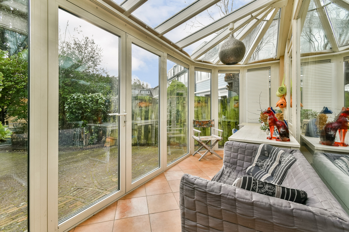 Aan de achterzijde bevindt zich de serre, een volwaardige uitbreiding van de leefruimte. De serre is voorzien van verwarming en openslaande deuren naar de achtertuin, waardoor binnen en buiten naadloos in elkaar overlopen.