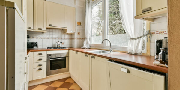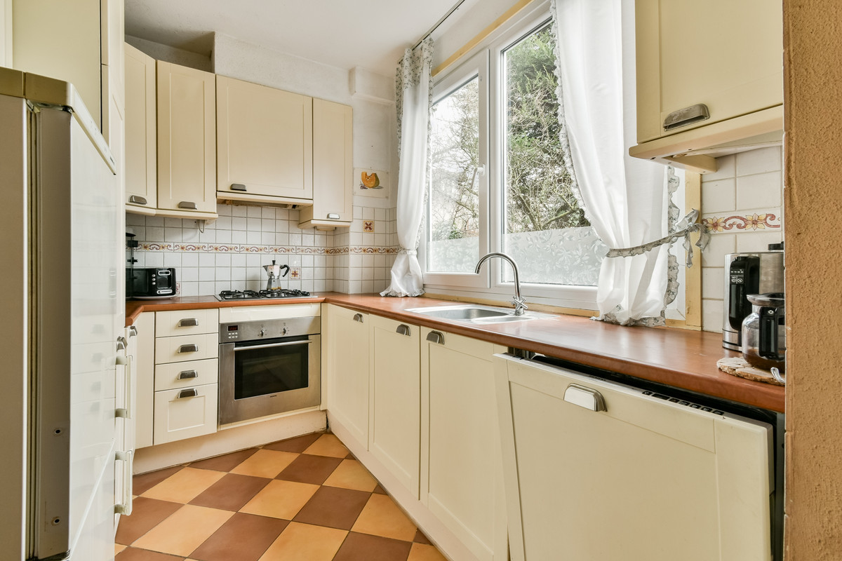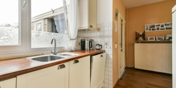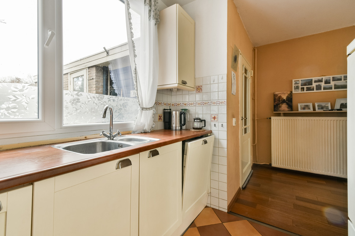 Aan de voorzijde van de woning is de keuken gesitueerd. Deze is voorzien van een 4-pits gaskookplaat, afzuigkap en vaatwasser en biedt een prettig uitzicht op de ruime voortuin.