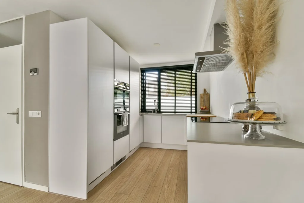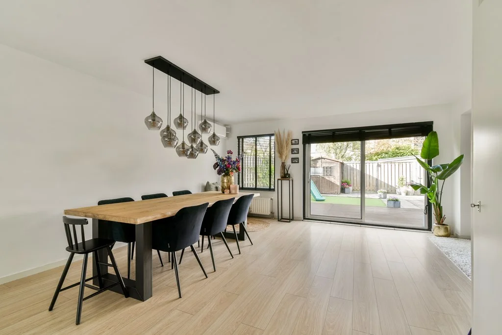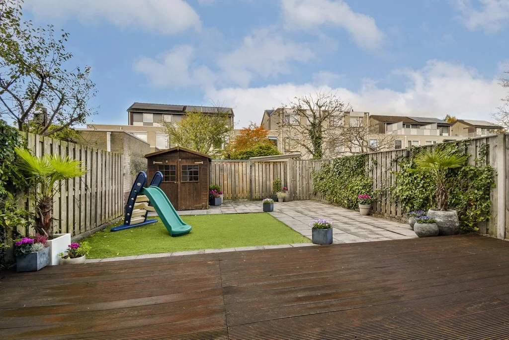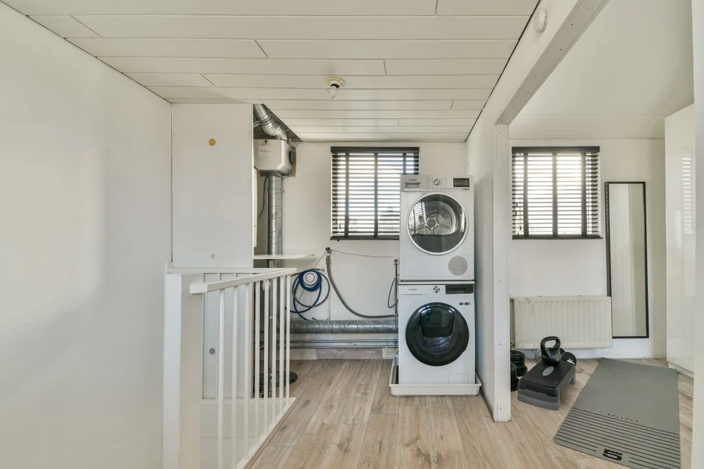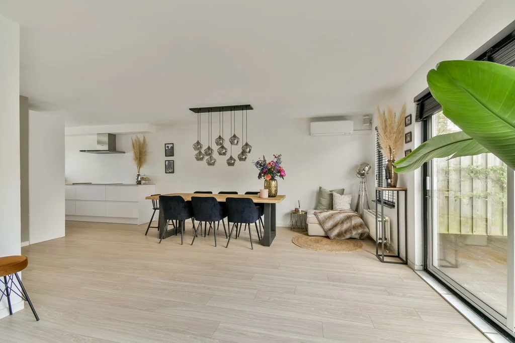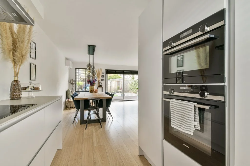 Entrance hall; separate toilet with hand basin; bright, spacious living room with windows spanning almost the entire width of the house, air conditioning, beautiful flooring, and access to the sunny garden (approx. 75m²) with a garden shed and rear access; modern kitchen (2019) equipped with a fridge/freezer, induction cooktop, two combination ovens, extractor hood, Quooker, and dishwasher.