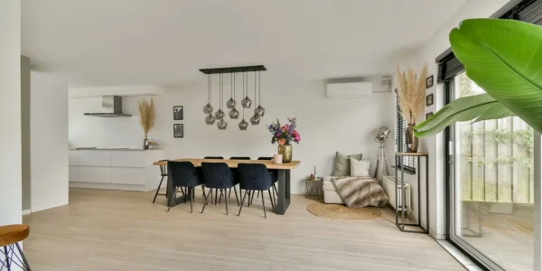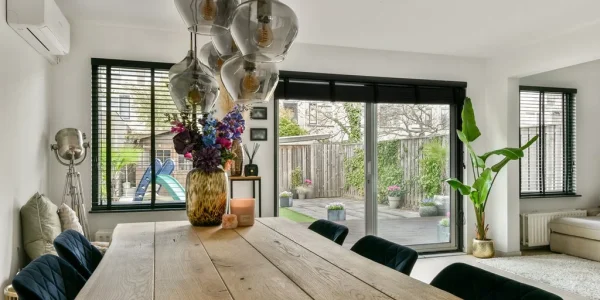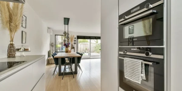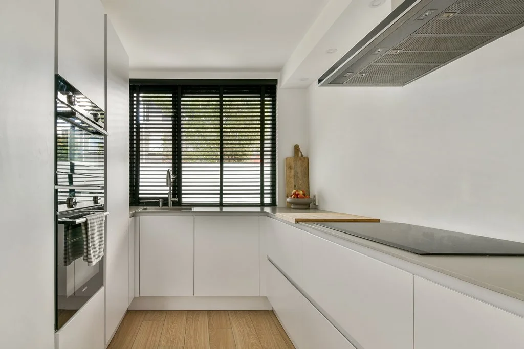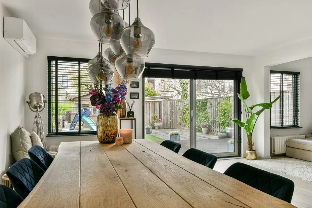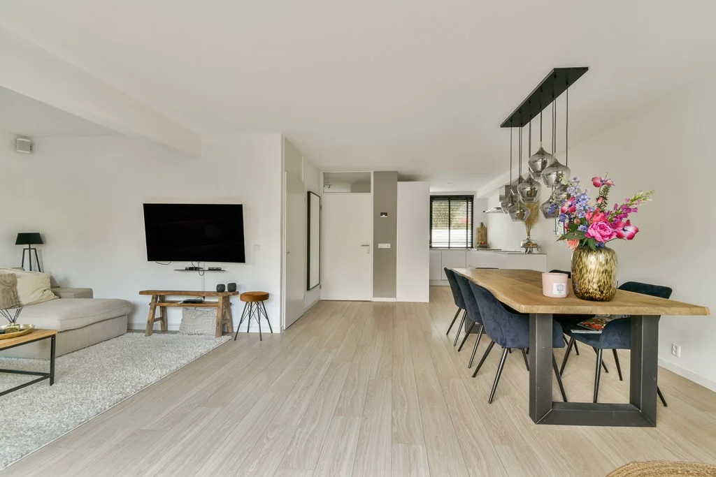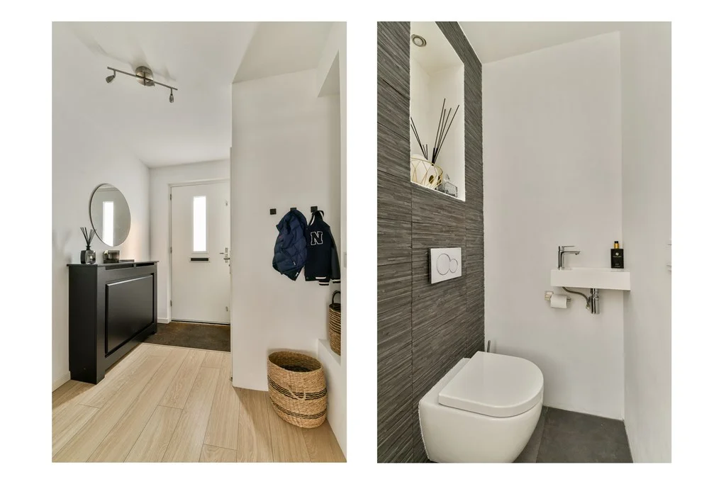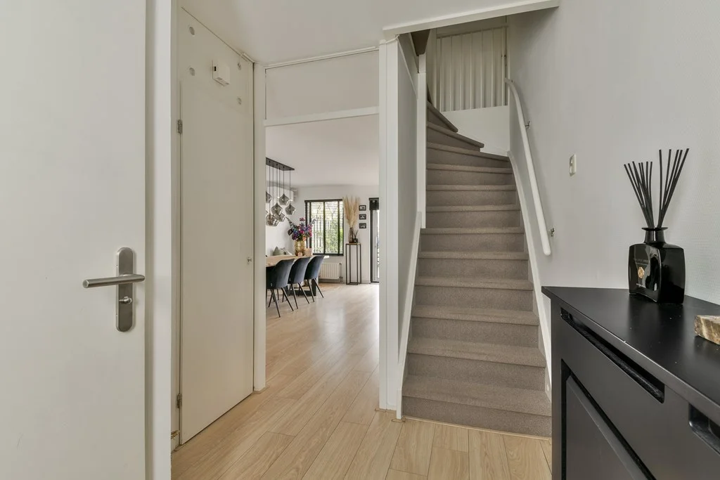 Entrance hall; separate toilet with hand basin; bright, spacious living room with windows spanning almost the entire width of the house, air conditioning, beautiful flooring, and access to the sunny garden (approx. 75m²) with a garden shed and rear access; modern kitchen (2019) equipped with a fridge/freezer, induction cooktop, two combination ovens, extractor hood, Quooker, and dishwasher.