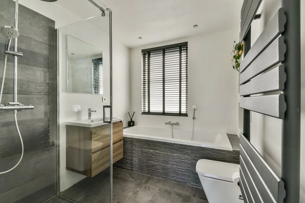 Landing; 4 spacious bedrooms, 3 of which have air conditioning; modern bathroom (2019) with a vanity, wall-hung toilet, bathtub, and walk-in shower.