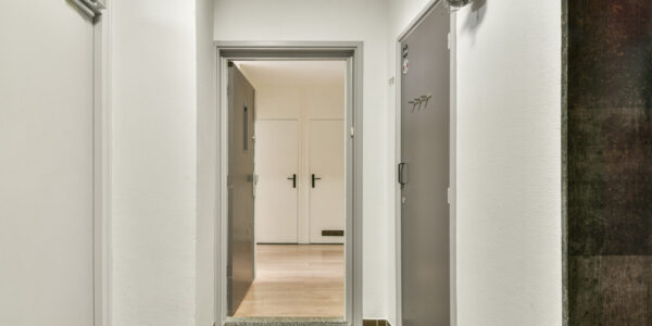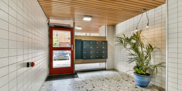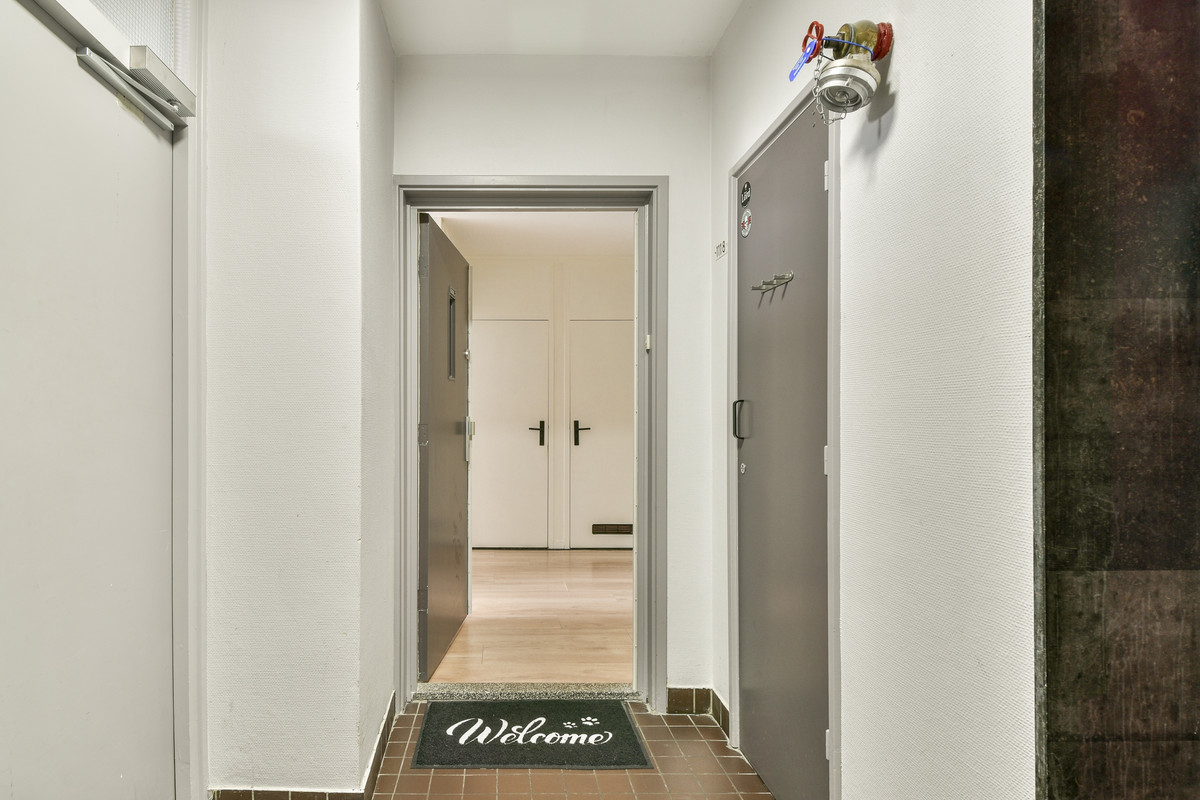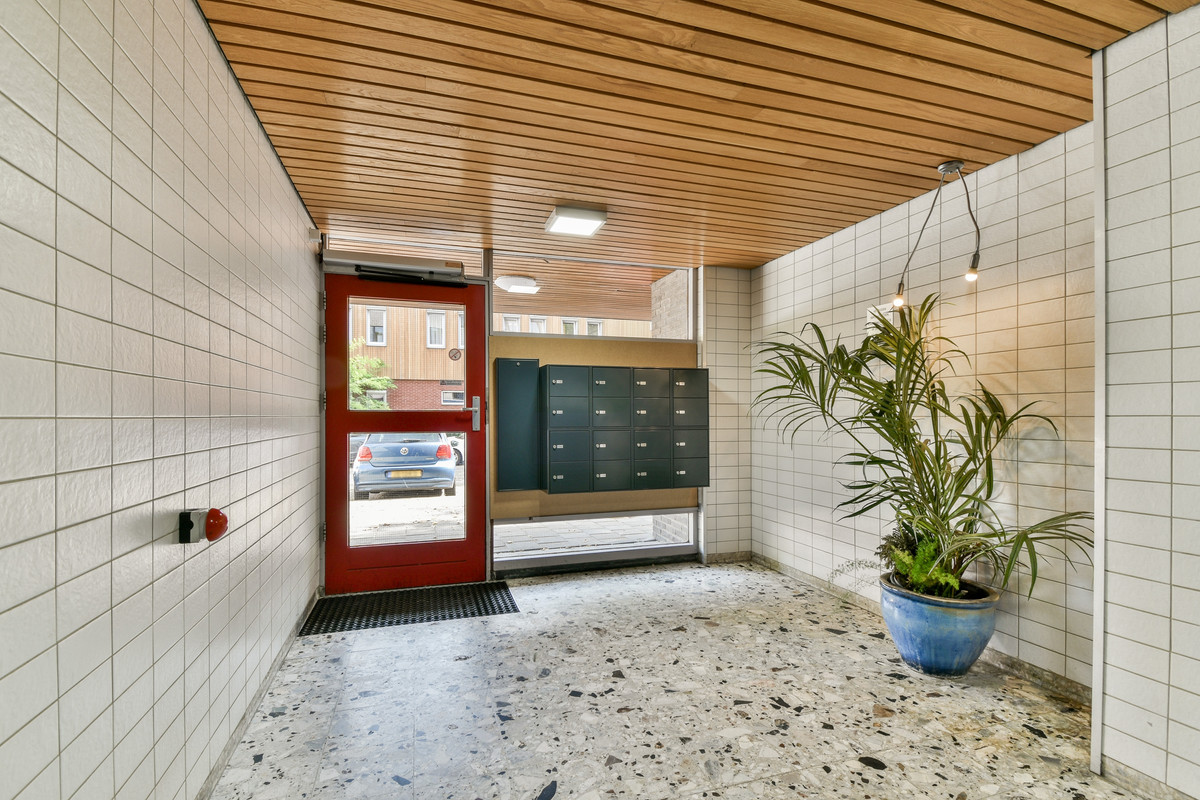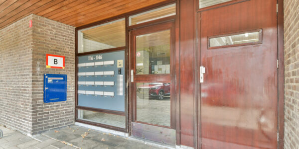 Beveiligde entree, bellentableau en deur naar de trap. Ook de aparte berging ad 5m² bevindt zich op de begane grond en is gelegen vlakbij de entree. Parkeren is gemakkelijk, er is plek genoeg direct voor de deur.