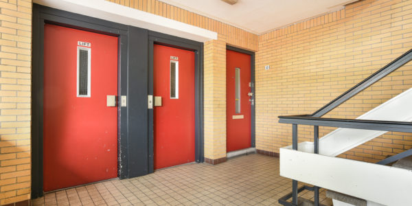 Gesloten portiek met brievenbussen en bellentableau, trappenhuis of lift naar de eerste verdieping waar zich bevinden: