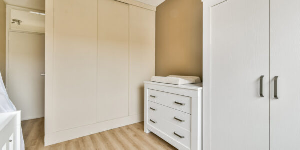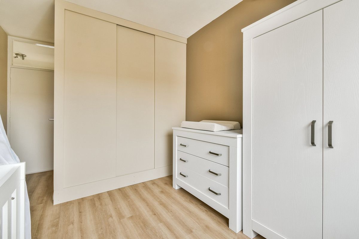 Slaapkamer 2: Fijne afmeting. Beschikt over een vaste schuifdeurkast waarin de 80L boiler en de wasmachine-/drogeropstelling slim zijn weggewerkt.