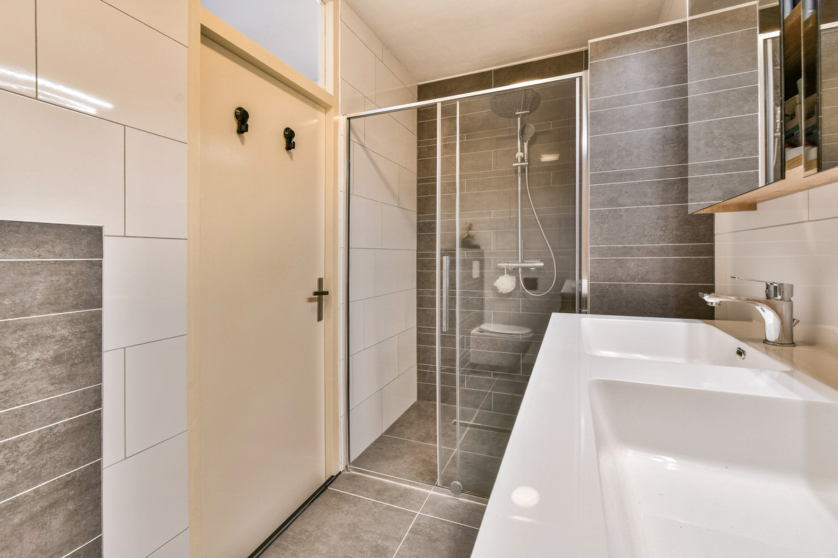 Woonverdieping (2e etage): Entree, ontvangsthal met meterkast (7 groepen + Perilex-aansluiting), een moderne toiletruimte met hangend toilet en fonteintje en een vaste trap naar de bovenverdieping. De ruime en lichte woonkamer aan de achterzijde is een heerlijke plek om te verblijven. De keuken in U-opstelling aan de voorzijde is van alle gemakken voorzien, waaronder een koel-/vriescombinatie, vaatwasser, combi-oven, recirculatie-afzuigkap en een inductiekookplaat. De woonkamer beschikt over een praktische extra opbergkast. De gehele verdieping is voorzien van een strakke, moderne PVC-vloer en nette plinten en in de woonkamer bevinden zich in een koof sfeervolle inbouwspots.