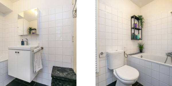 Ruime hal met toegang tot alle ruimtes van dit appartement; lichte ruime woonkamer met lichte eikenhouten parketvloer en de authentieke en-suite kasten, hier wordt je dagelijks begroet door de zonnestralen die door de grote ramen schijnen; moderne open keuken aan de achterzijde met diverse inbouwapparatuur (o.a. combi-ovenmagnetron, koel/vrieskast 4 pits gaskookstel en vaatwasser) en biedt toegang tot het balkon op het oosten met uitzicht op de prachtige groene binnentuin; Zeer ruime slaapkamer aan de voorzijde met tevens een balkon waar je tot ’s avonds laat nog kunt genieten van de zon; Tweede ruime slaapkamer aan de achterzijde; Moderne badkamer voorzien van een ligbad, douche, toilet en een wastafel met bijpassend meubel.