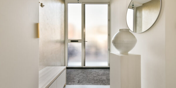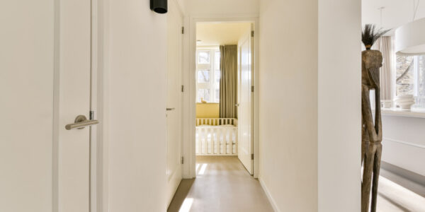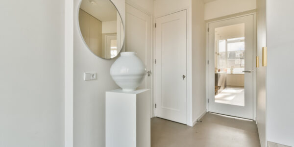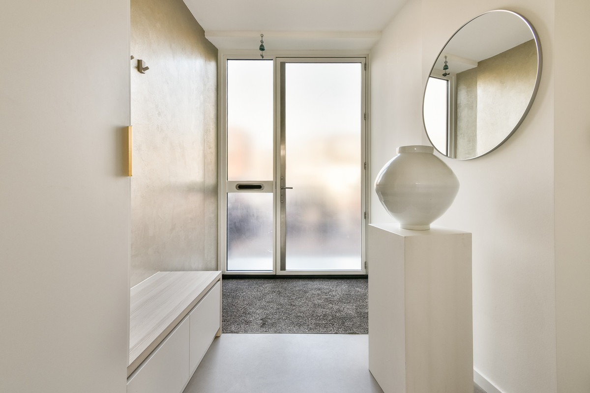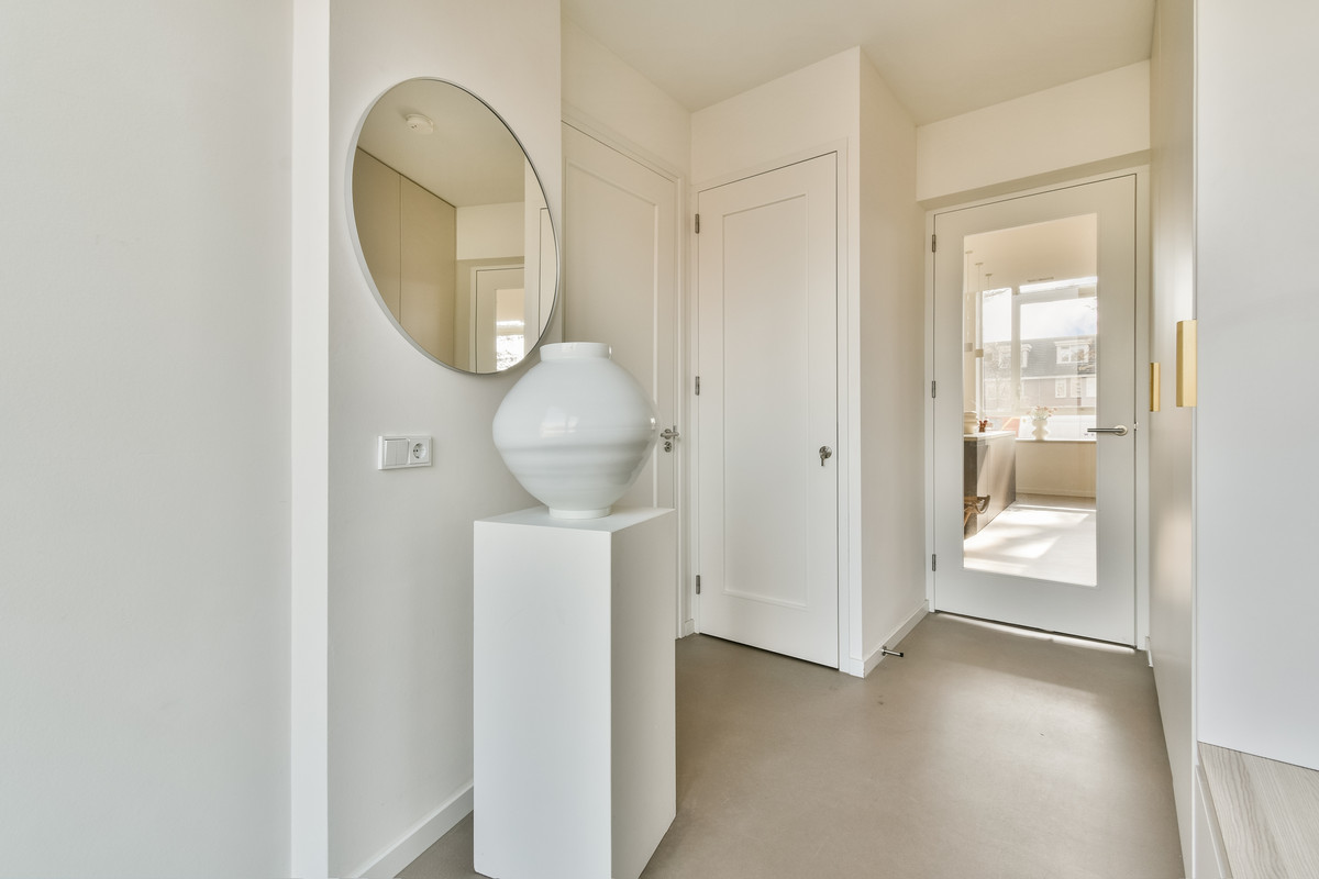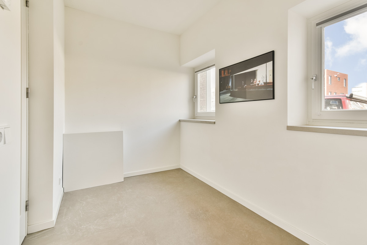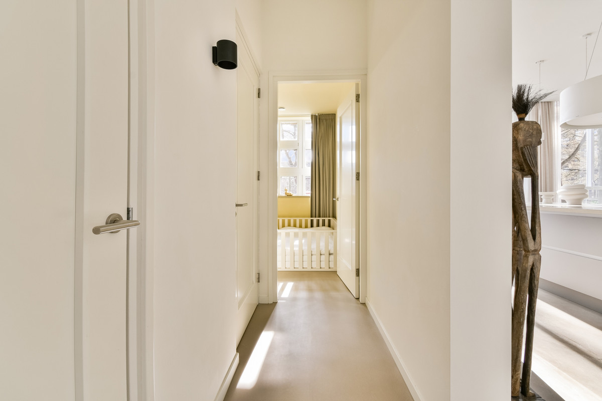 Bij binnenkomst komt u in een ruime entree en ontvangsthal met praktische vaste kasten. Hier bevinden zich tevens de meterkast met tien groepen en een modern uitgevoerd hangend toilet met fontein. Vanuit de hal bereikt u de royale woonkamer, waar de indrukwekkende plafondhoogte (ca. 3.20m) en de grote raampartijen direct opvallen. Het licht stroomt hier rijkelijk naar binnen en benadrukt het loftachtige karakter van de woning.