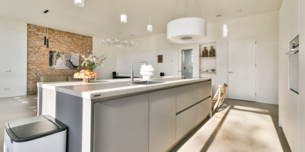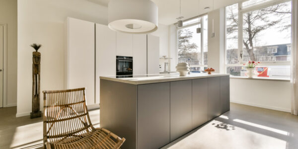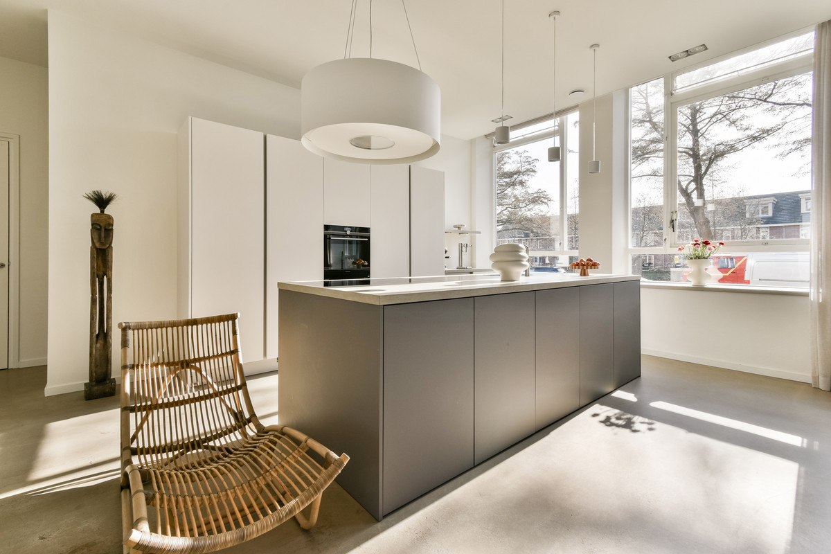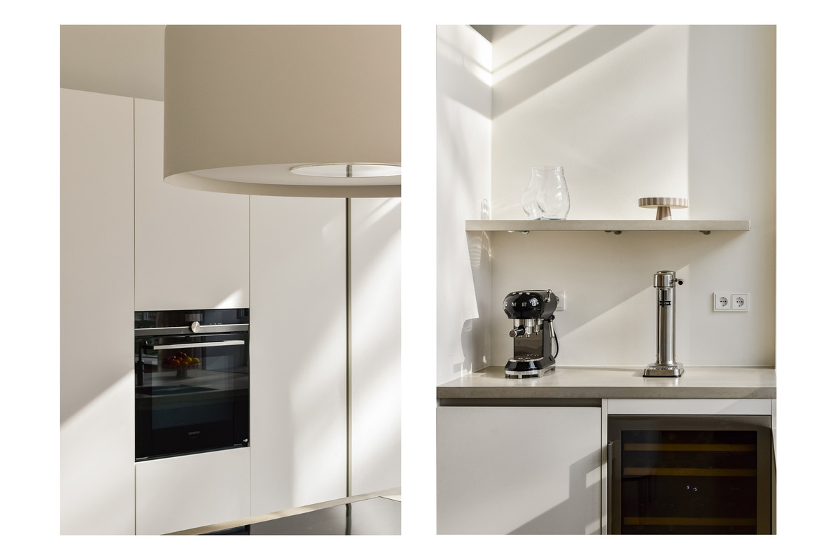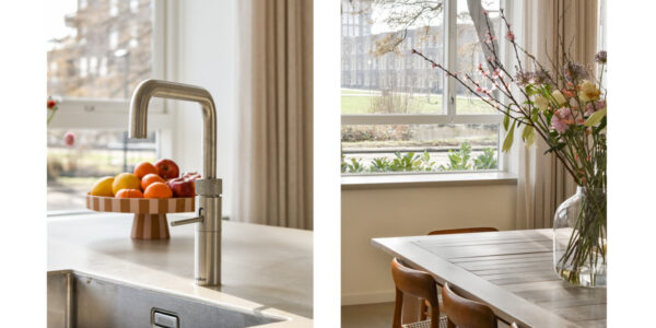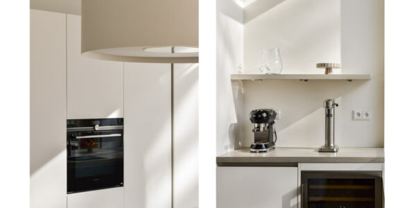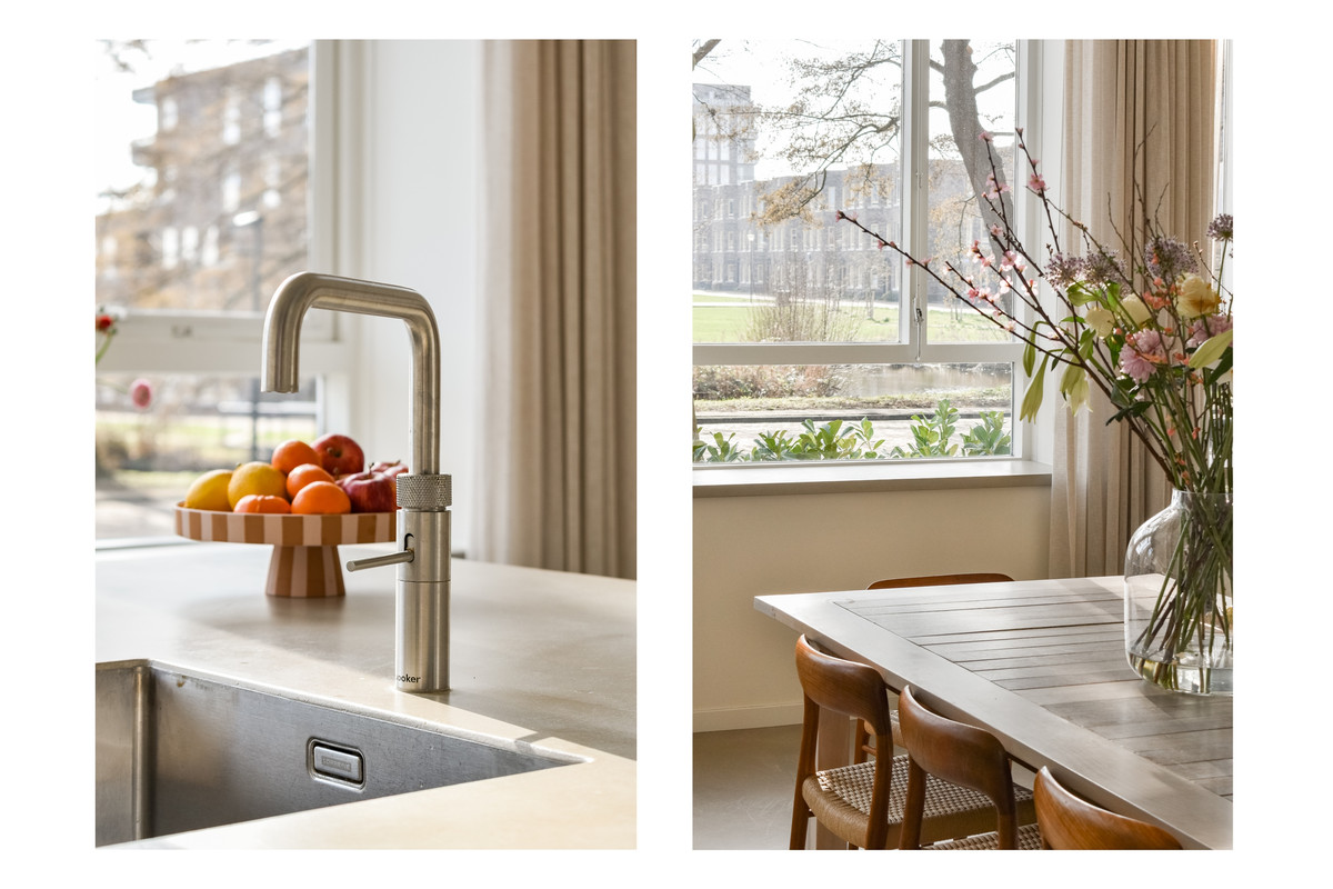 De open woonkeuken is luxe uitgevoerd en vormt een centraal punt in de woning. De keuken is voorzien van een inductiekookplaat met recirculatie-afzuiginstallatie, een Quooker, vaatwasser, wijnklimaatkast, een grote koelkast, een ruime vrieskast en een stoomoven-combinatie. Het geheel is modern vormgegeven en biedt alle comfort voor wie graag kookt en uitgebreid tafelt.