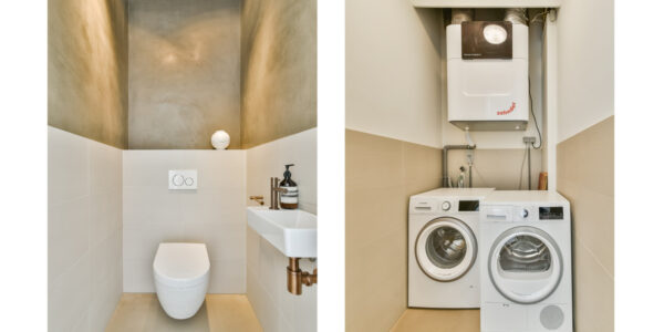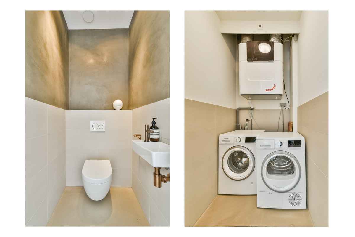 In de woning bevinden zich twee technische ruimtes. In een vaste kast zijn de warmtepomp en de omvormer van de zonnepanelen geplaatst. Een tweede technische ruimte beschikt over de aansluitingen voor wasmachine en droger en herbergt tevens het WTW-systeem.