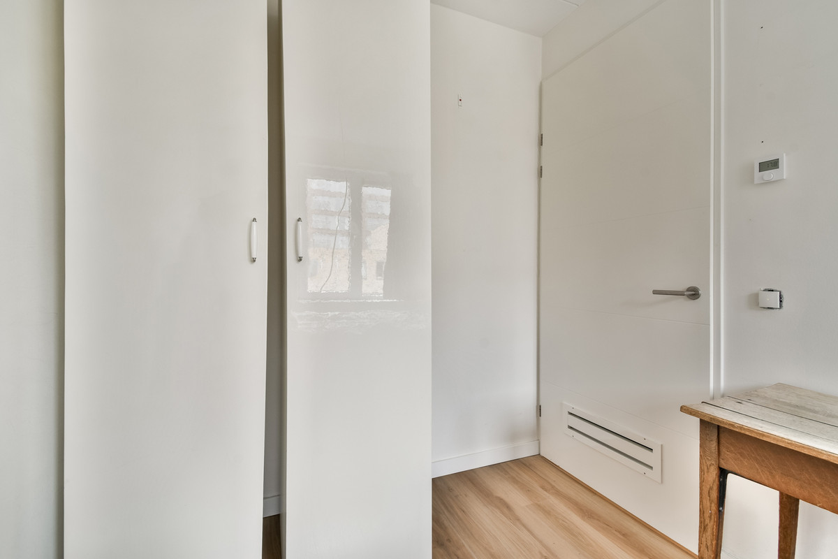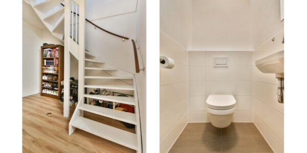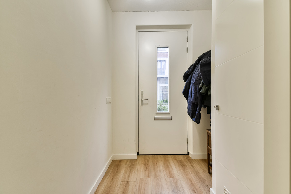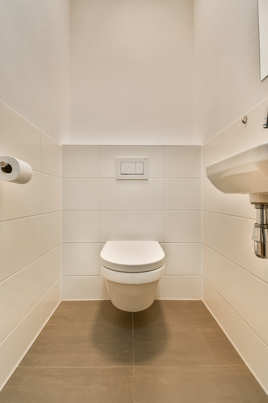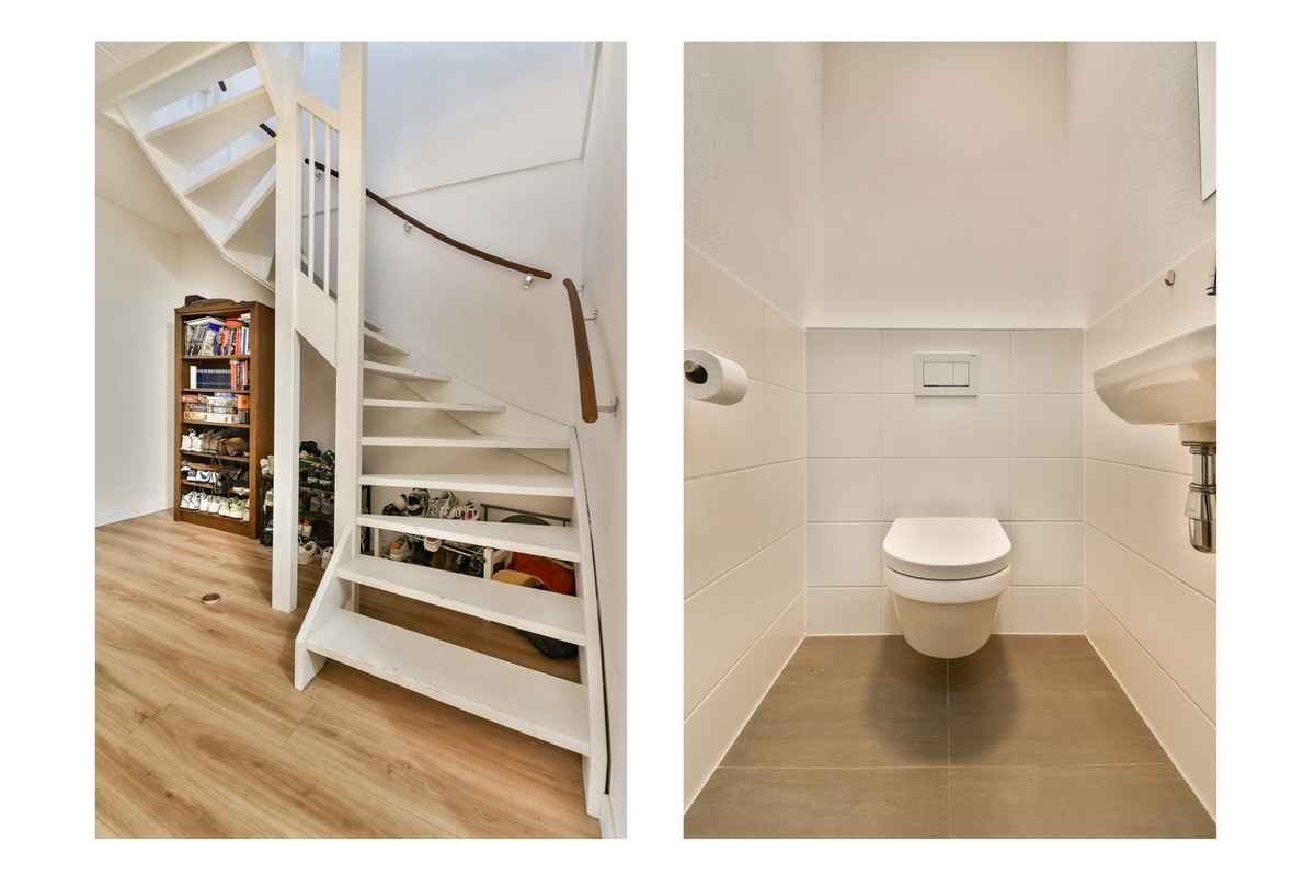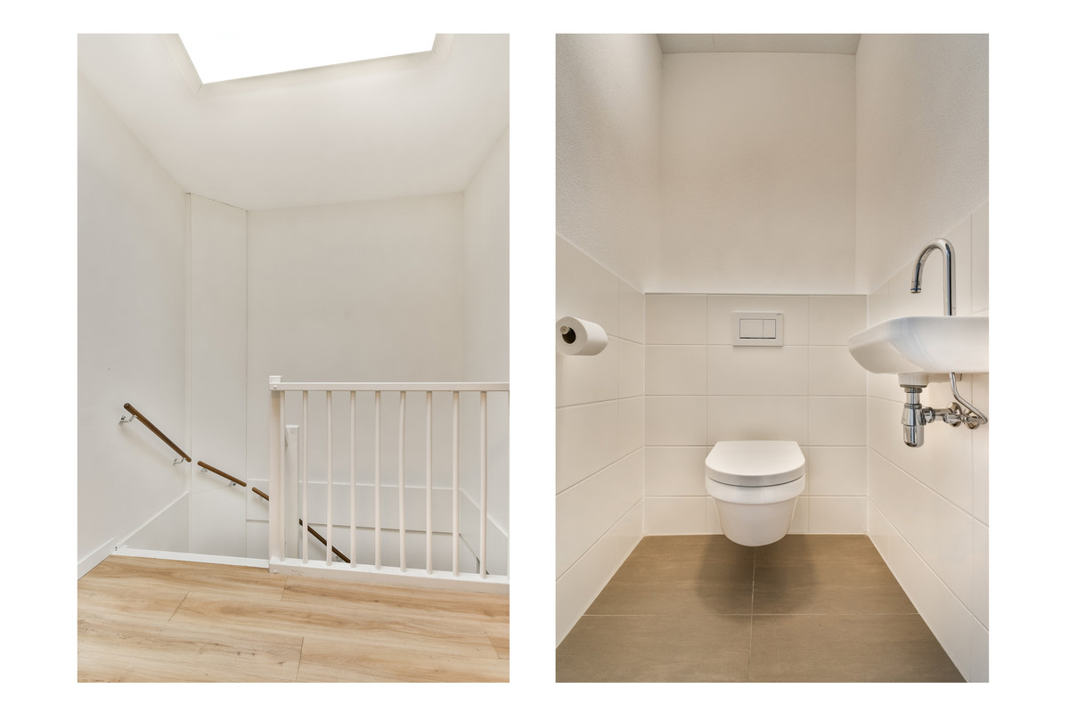 Entree met hal en modern zwevend toilet. Op deze verdieping bevinden zich meerdere slaap- en/of werkkamers en een ruime wasruimte – ideaal voor thuiswerken of een gezinssituatie.