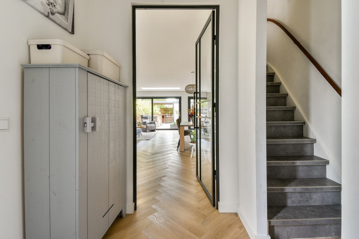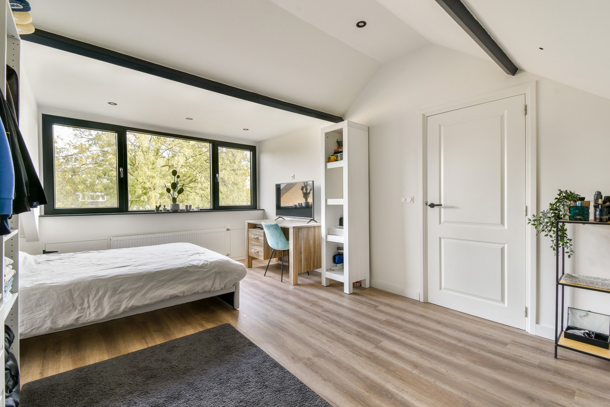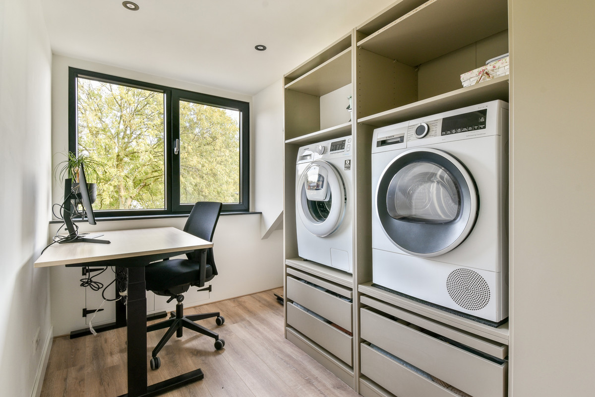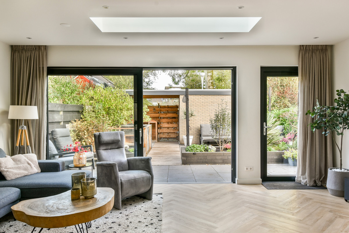 Upon entering the spacious hall, you immediately experience the neat finishing and the warm atmosphere. The living room, extended in 2022, features a chic PVC herringbone floor and underfloor heating and is the heart of the home. The large sliding doors and a skylight ensure an abundance of natural light and an open connection with the modern kitchen, complete with Whirlpool appliances and a Quooker tap.